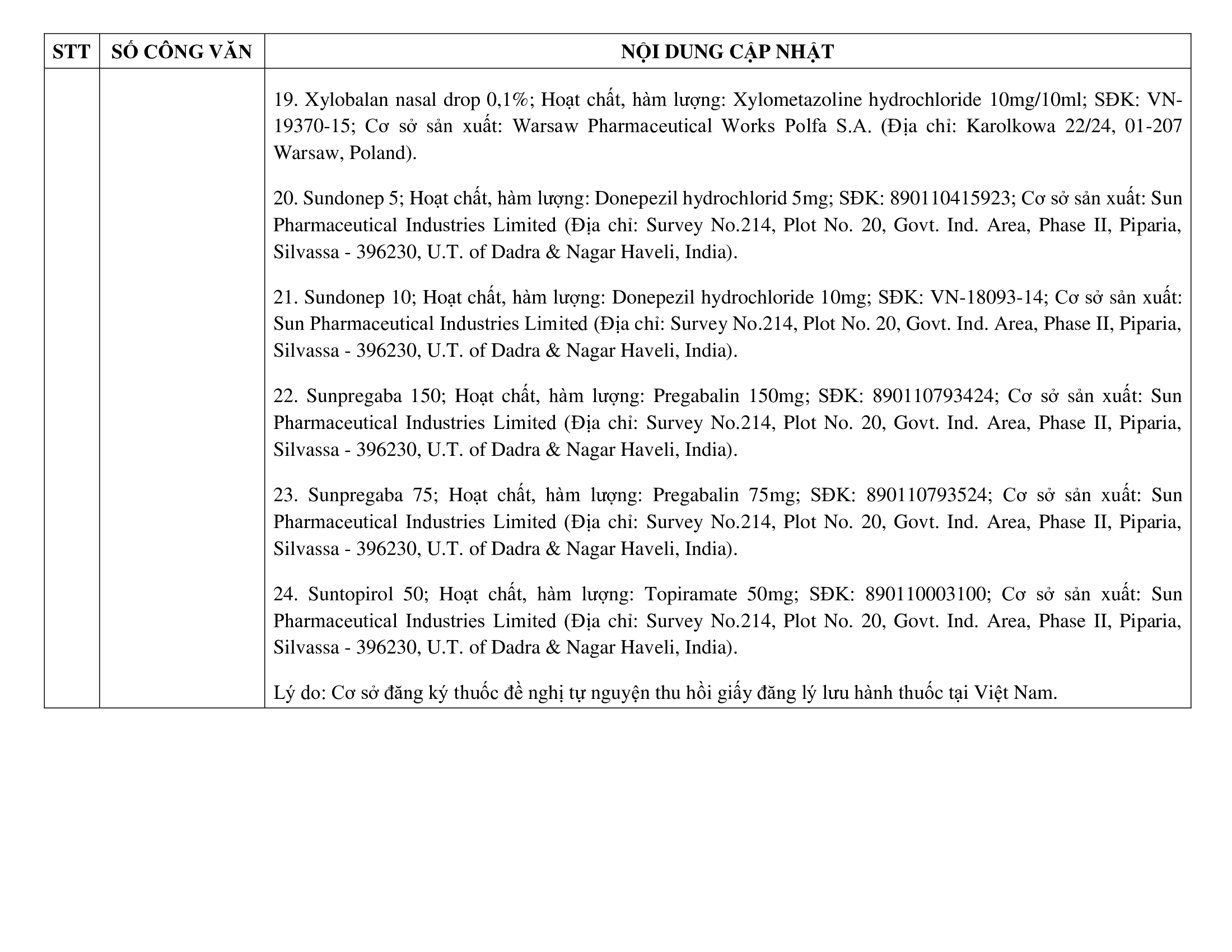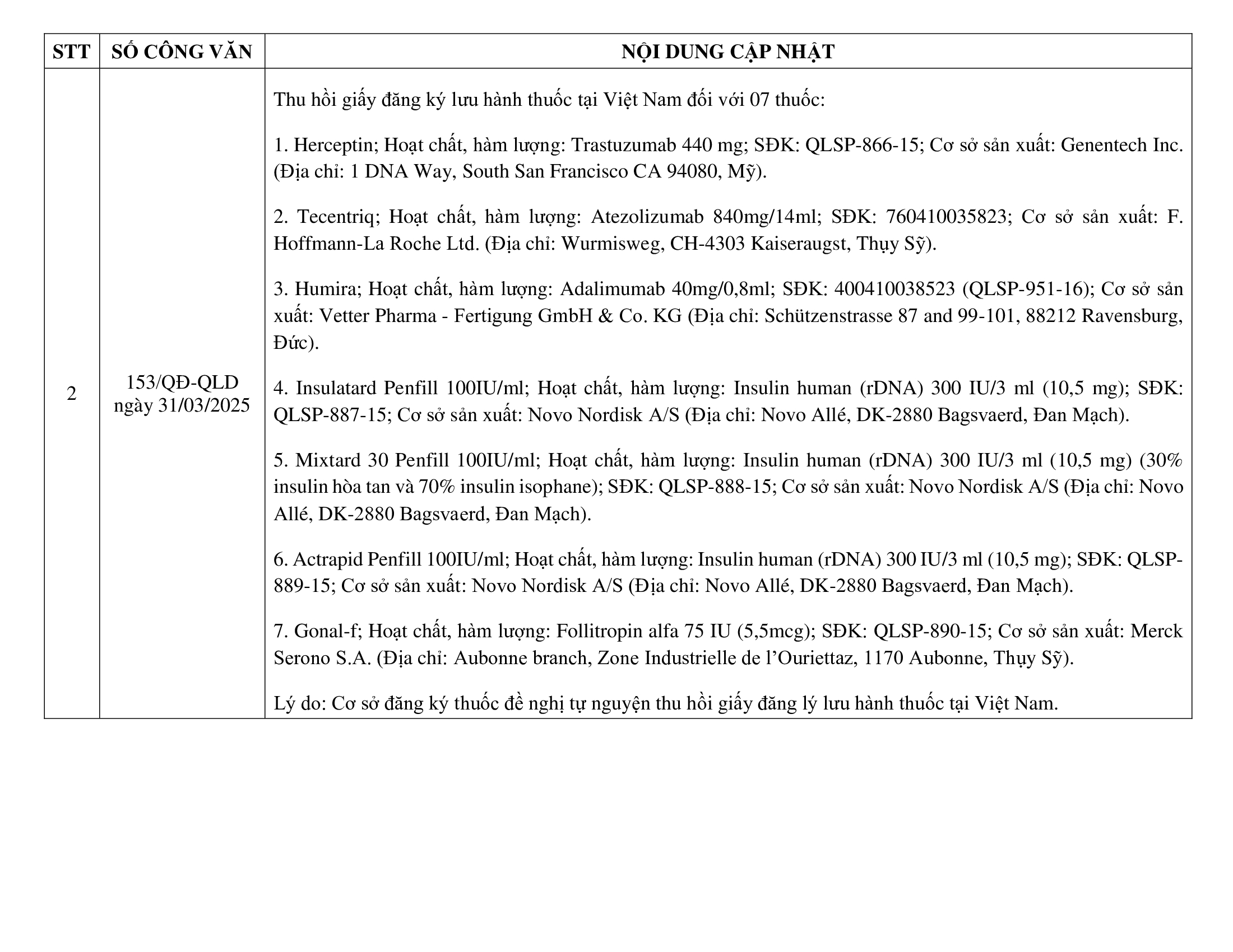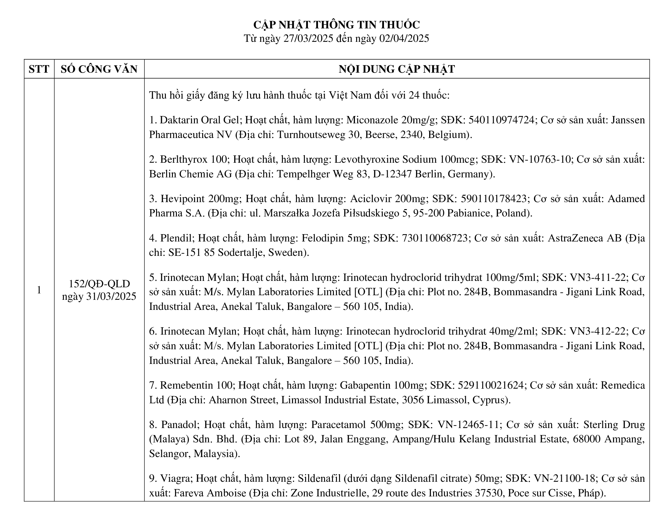 Cập nhật thông tin thuốc 27/03/2025 đến 02/04/2025