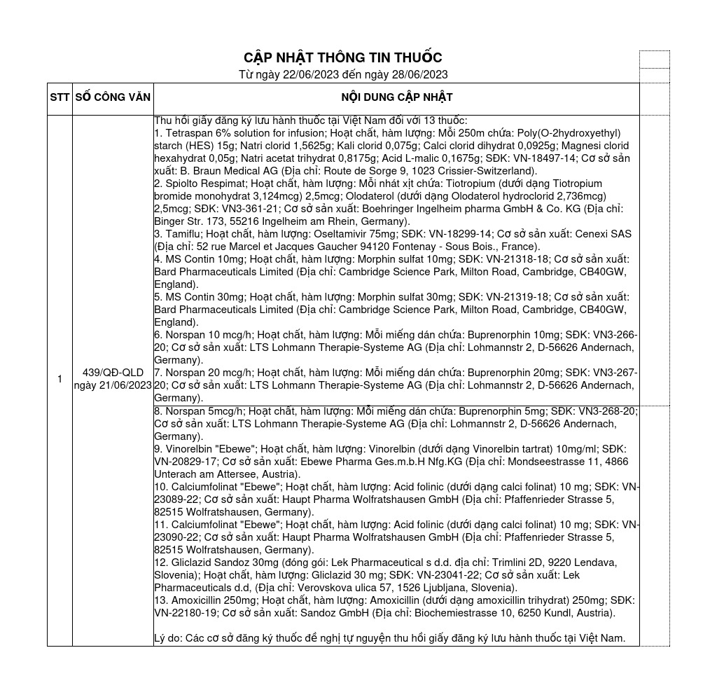 Cập nhật thông tin thuốc từ 22-06-2023 đến 28-06-2023