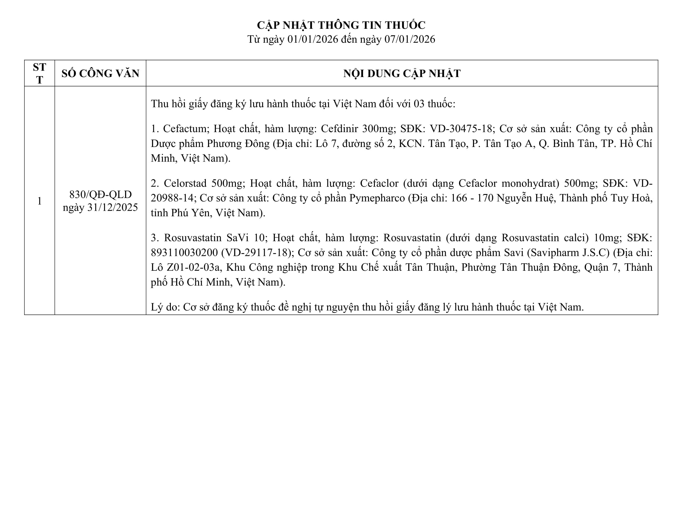 Cập nhật thông tin thuốc từ ngày 01/01/2026 đến 07/01/2026