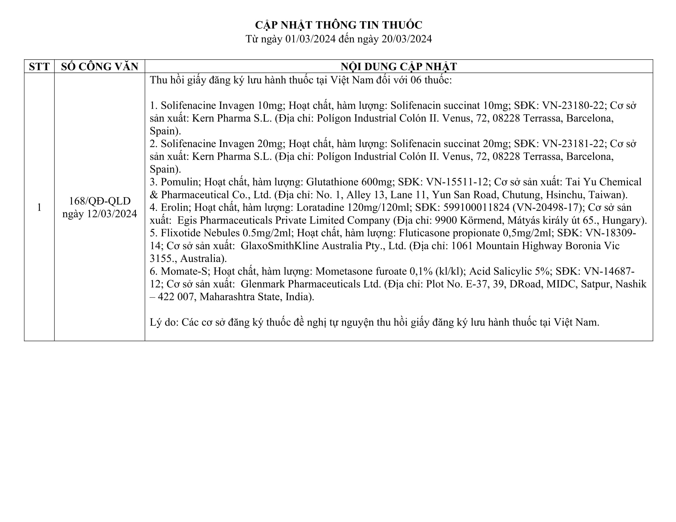 Cập nhật thông tin thuốc từ ngày 01/03/2024 đến ngày 20/03/2024