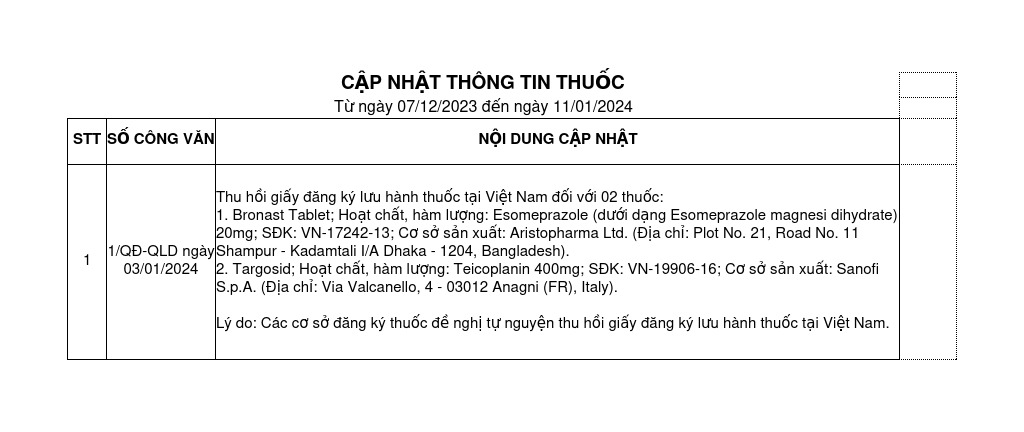 Cập nhật thông tin thuốc từ ngày 07/12/2023 đến ngày 11/01/2024