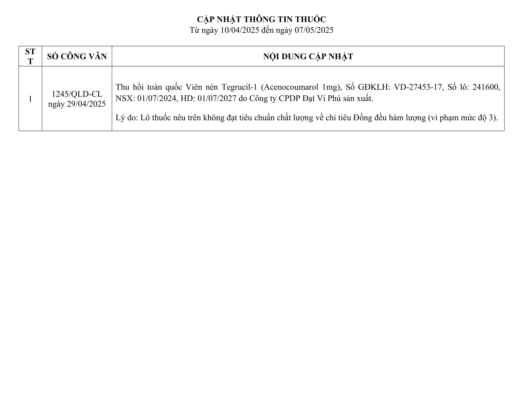 Cập nhật thông tin thuốc từ ngày 10/04/2025 đến ngày 07/05/2025