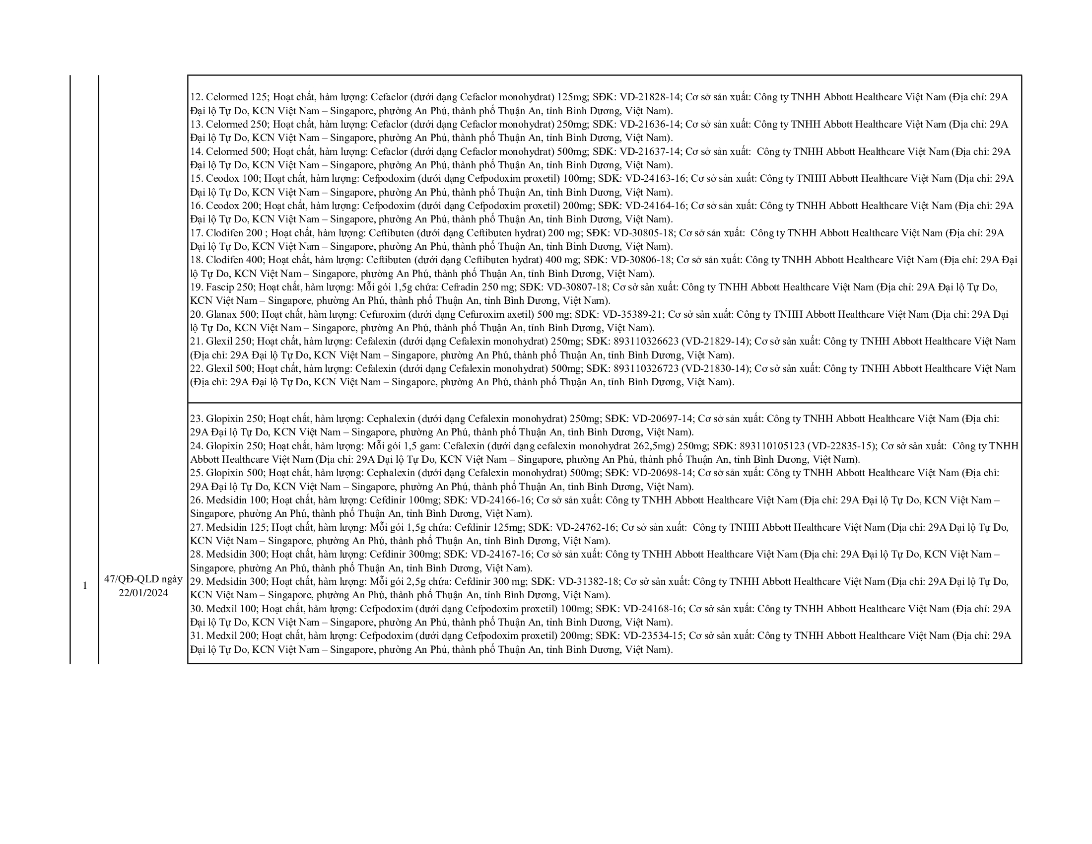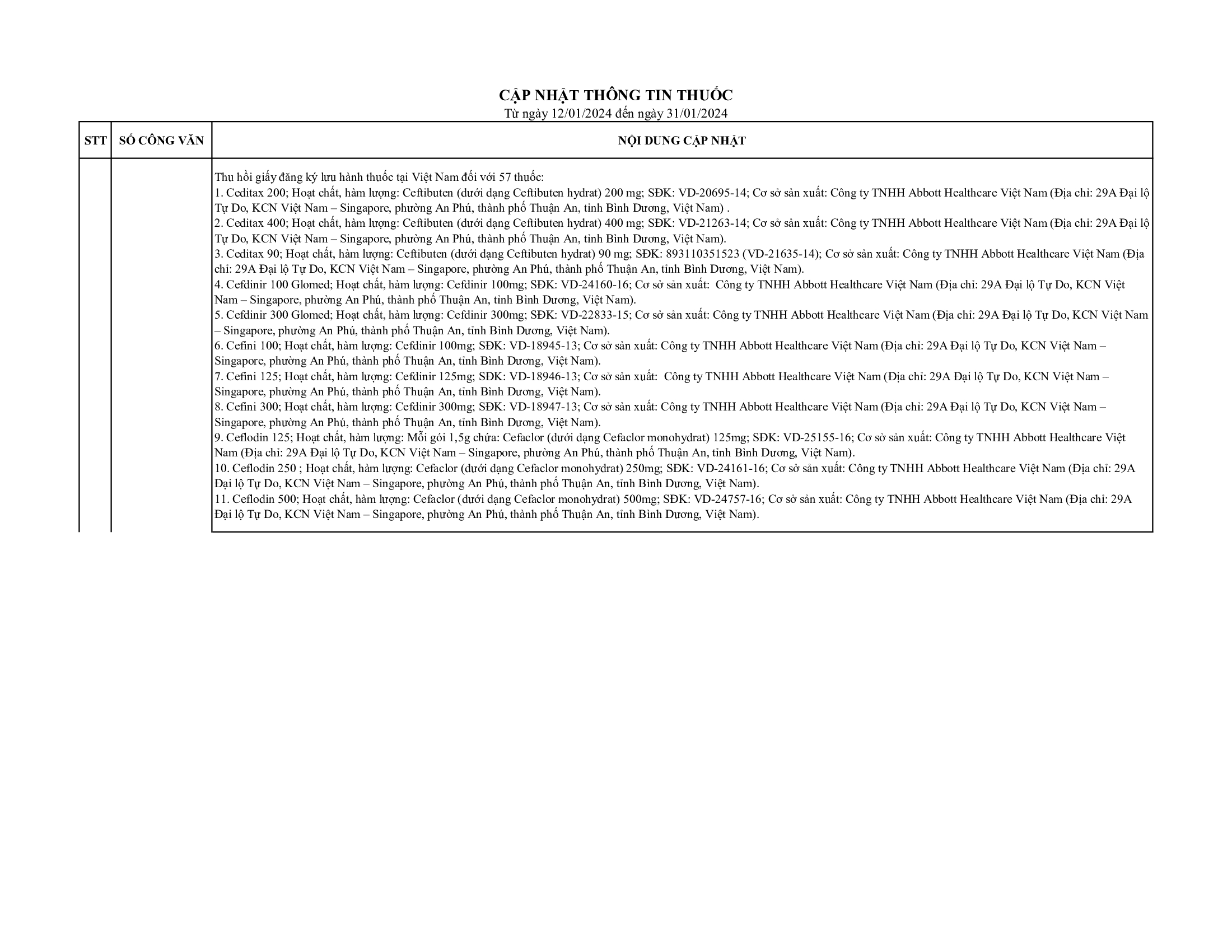 Cập nhật thông tin thuốc từ ngày 12/01/2024 đến 31/01/2024
