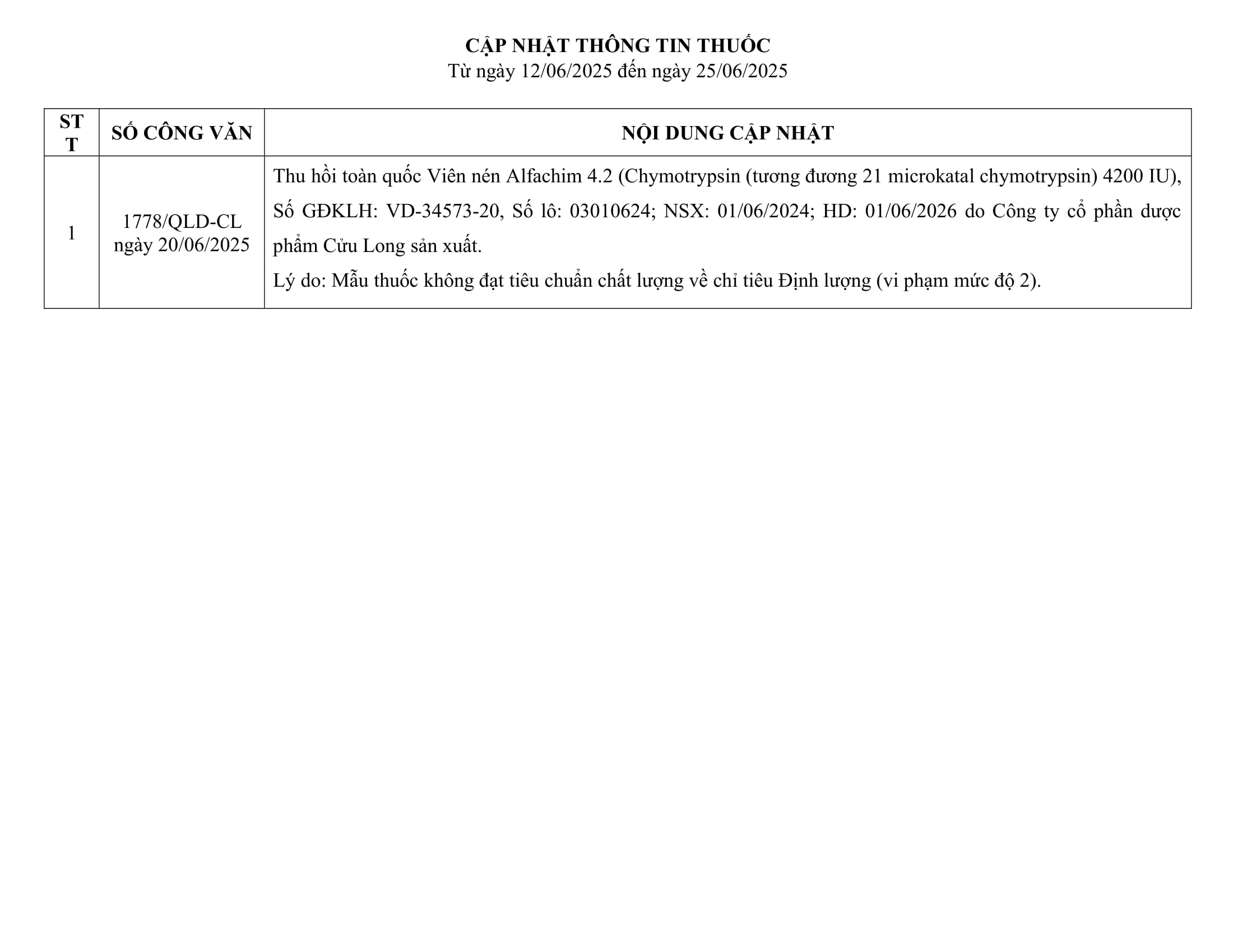 Cập nhật thông tin thuốc từ ngày 12/06/2025 đến ngày 25/06/2025