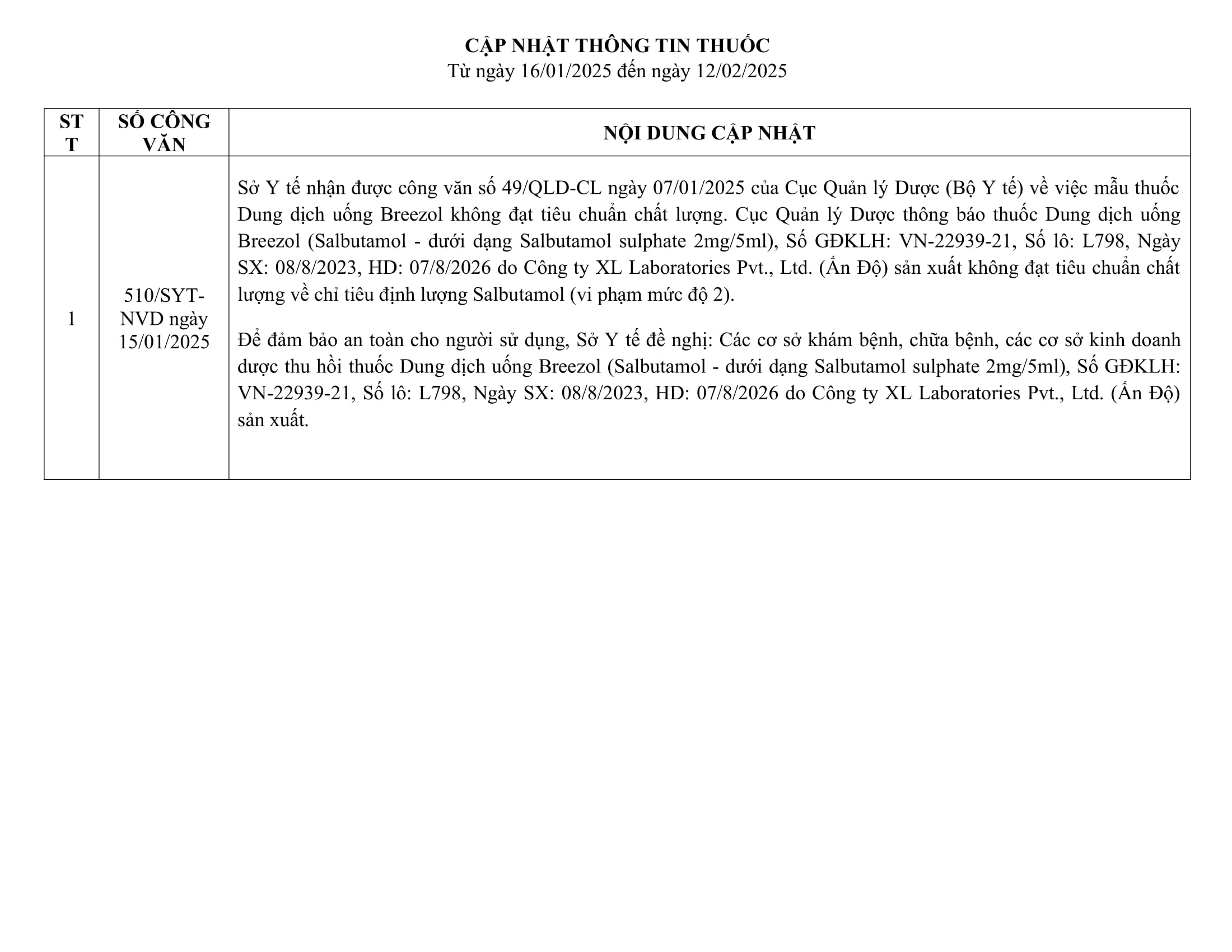 Cập nhật thông tin thuốc từ ngày 16/01/2025 đến ngày 12/02/2025