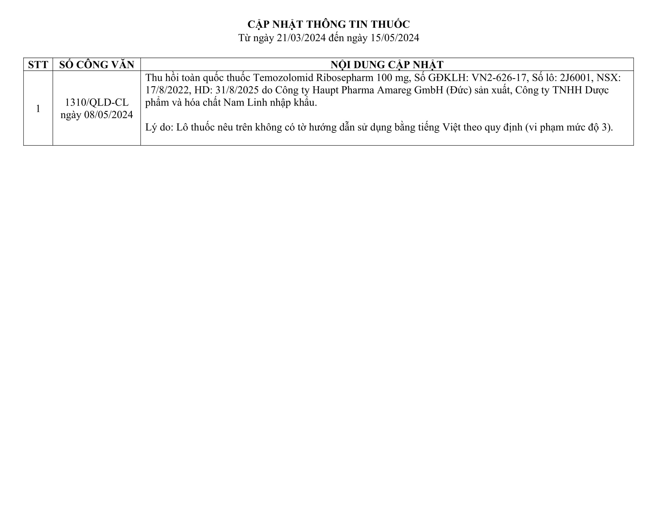 Cập nhật thông tin thuốc từ ngày 21/03/2024 đến 15/05/2024