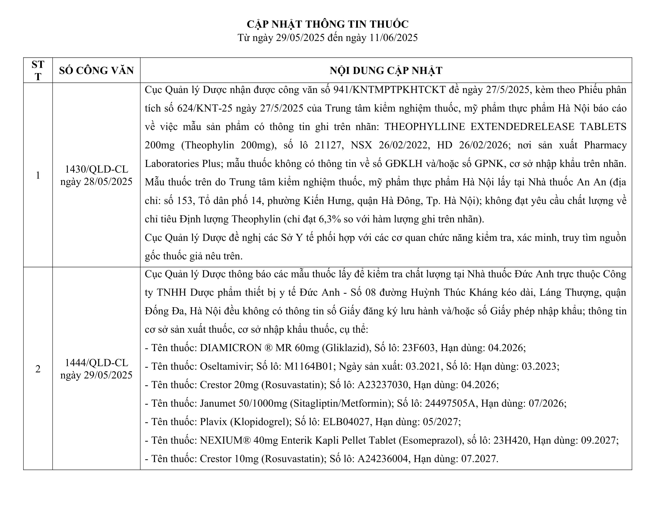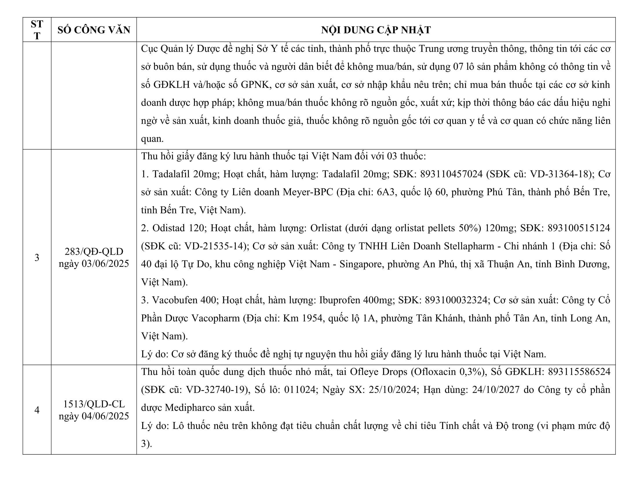 Cập nhật thông tin thuốc từ ngày 29/05/2025 đến ngày 11/06/2025