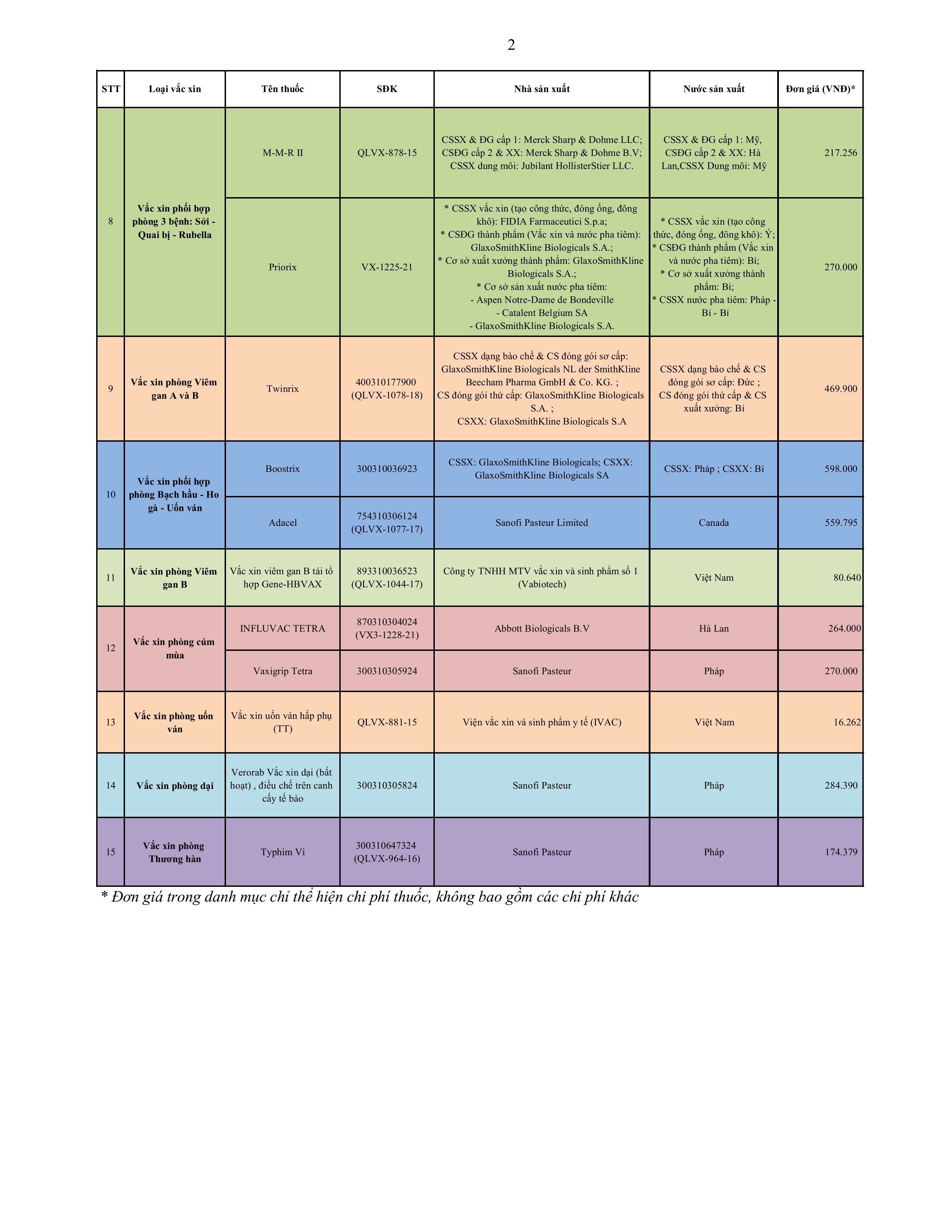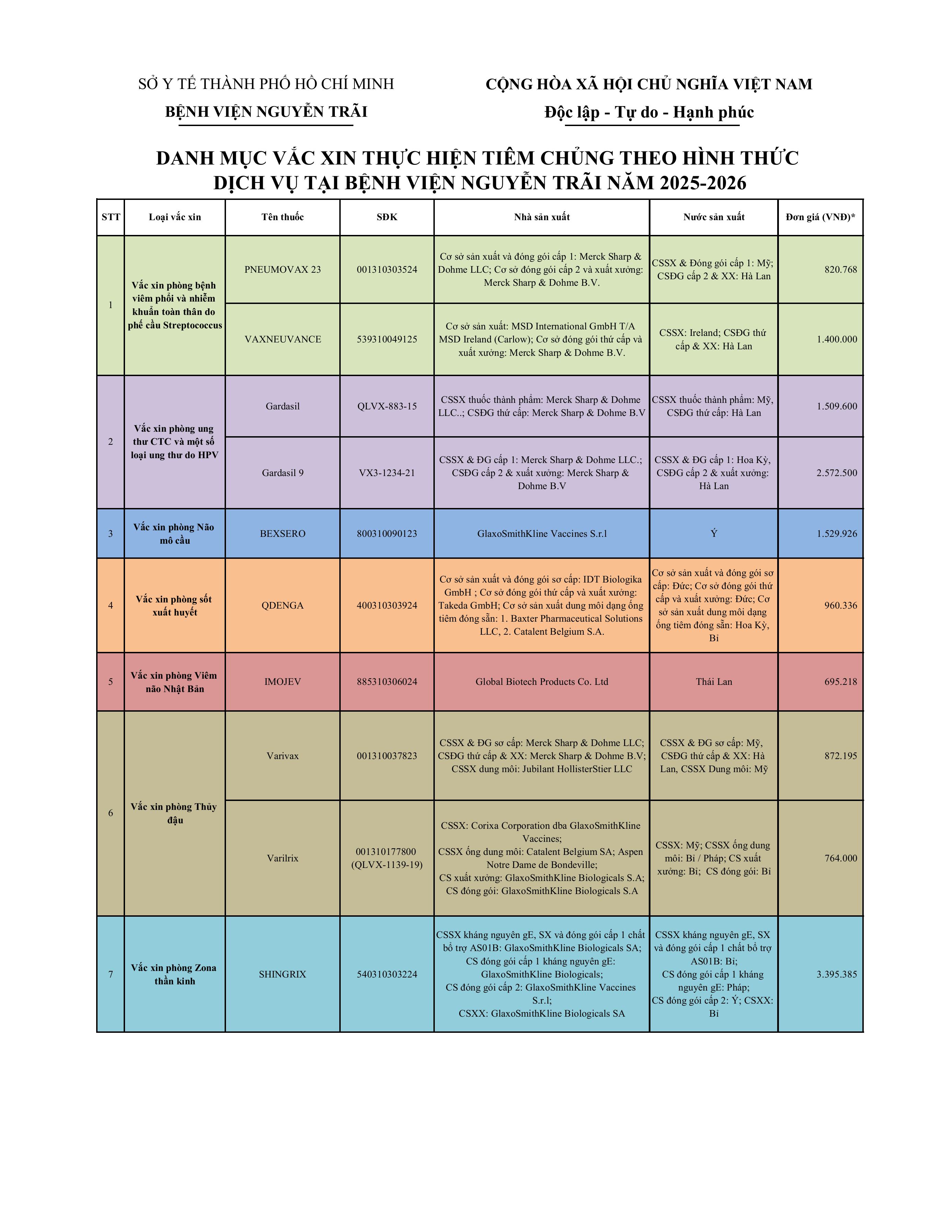 Danh mục vacxin thực hiện tiêm chủng theo hình thức dịch vụ tại bệnh viện Nguyễn Trãi năm 2025-2026