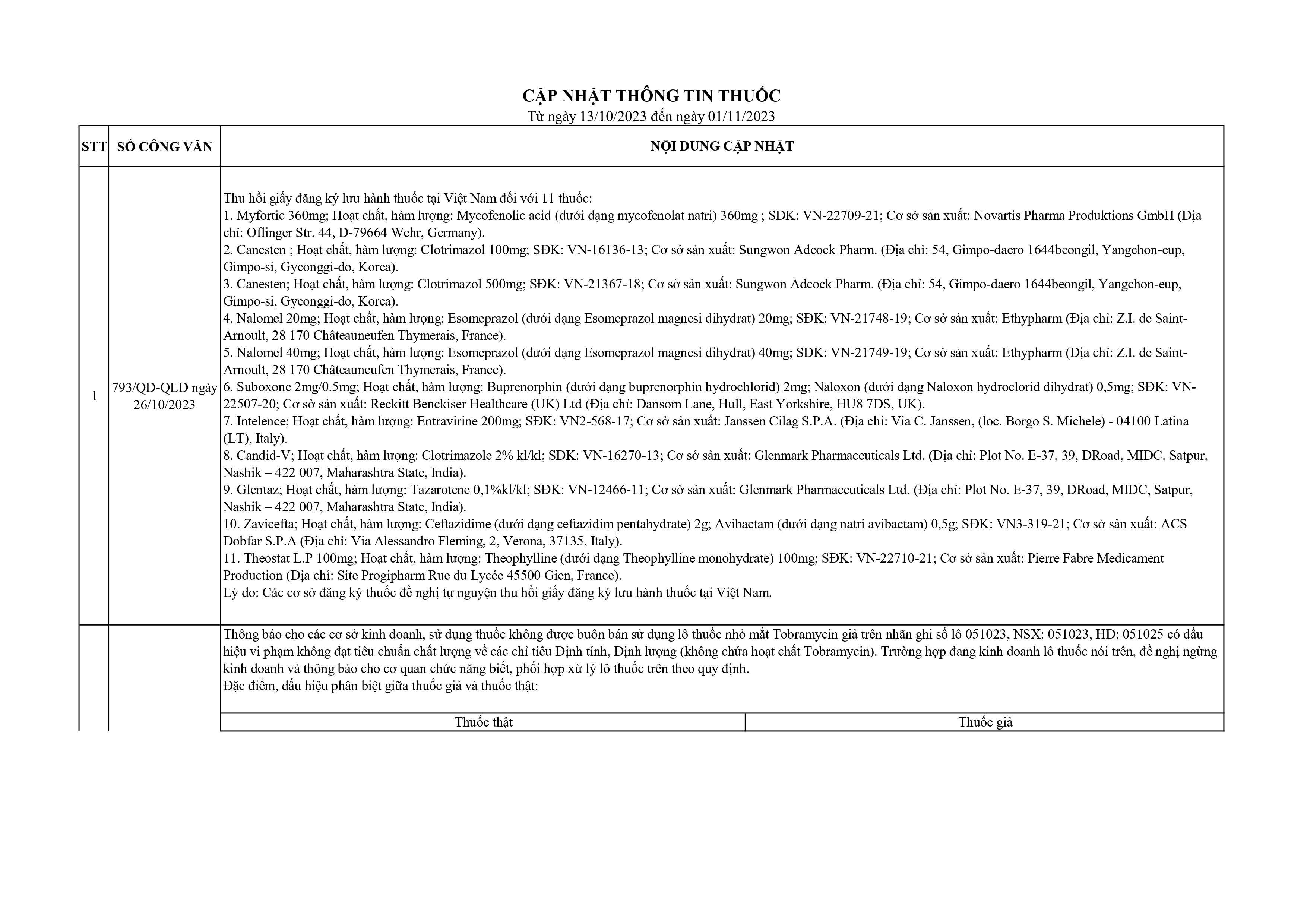 Cập nhật thông tin thuốc từ 13-10-2023 đến ngày 1-11-2023