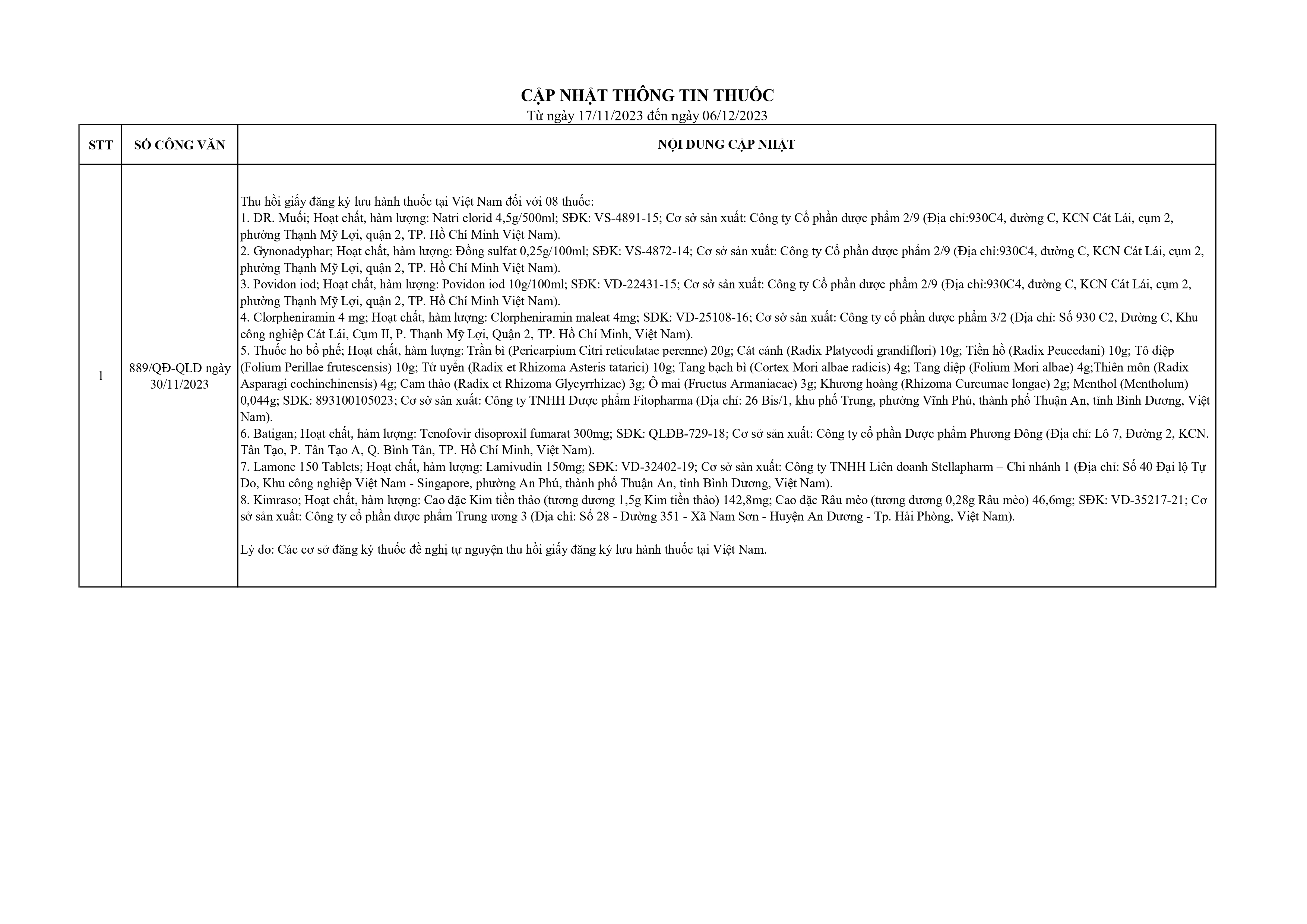 Cập nhật thông tin thuốc từ 17/11/2023 đến 6/12/2023