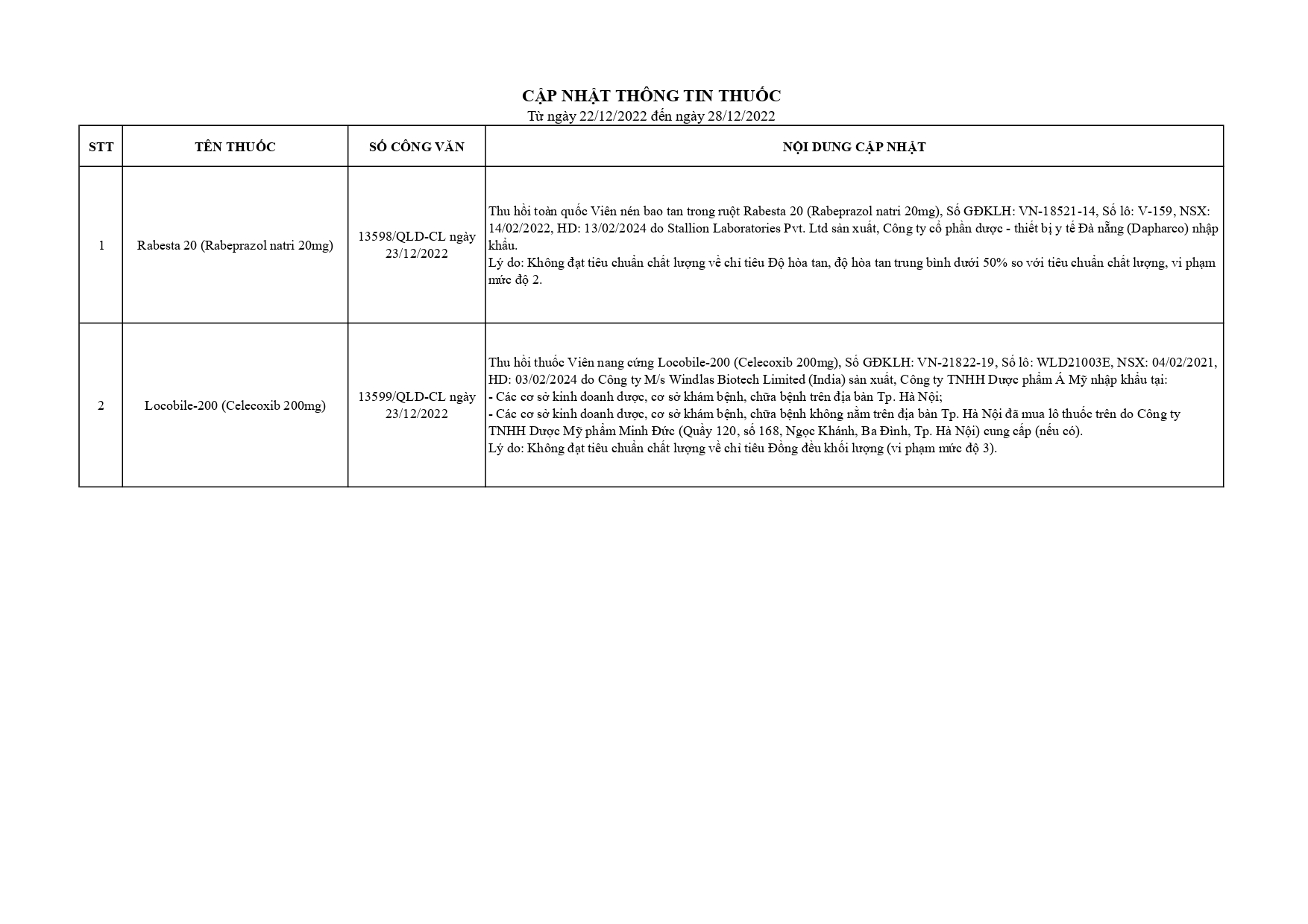 Cập nhật thông tin thuốc từ 22-12-2022 đến 28-12-2022