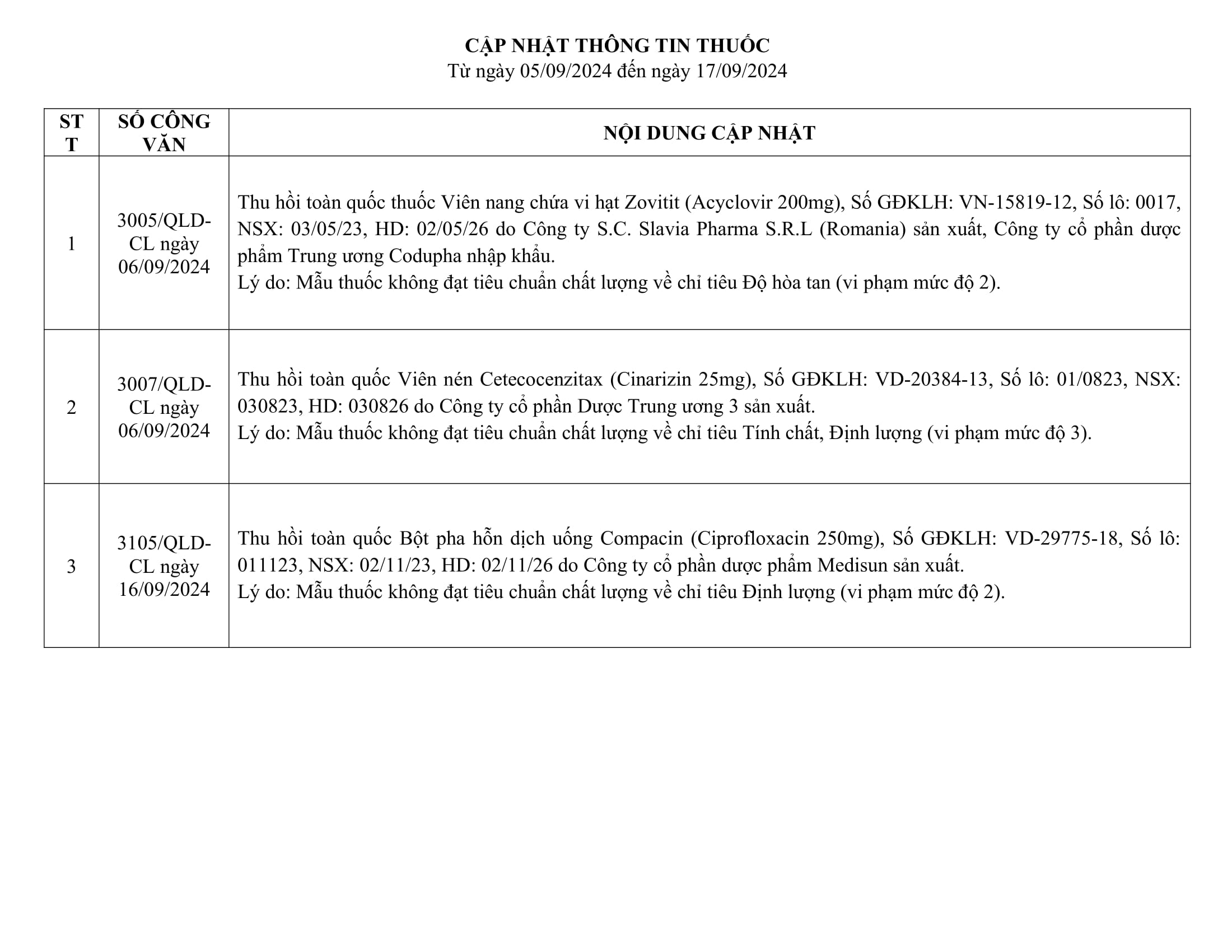 Cập nhật thông tin thuốc từ ngày 05/09/2024 đến ngày 17/09/2024