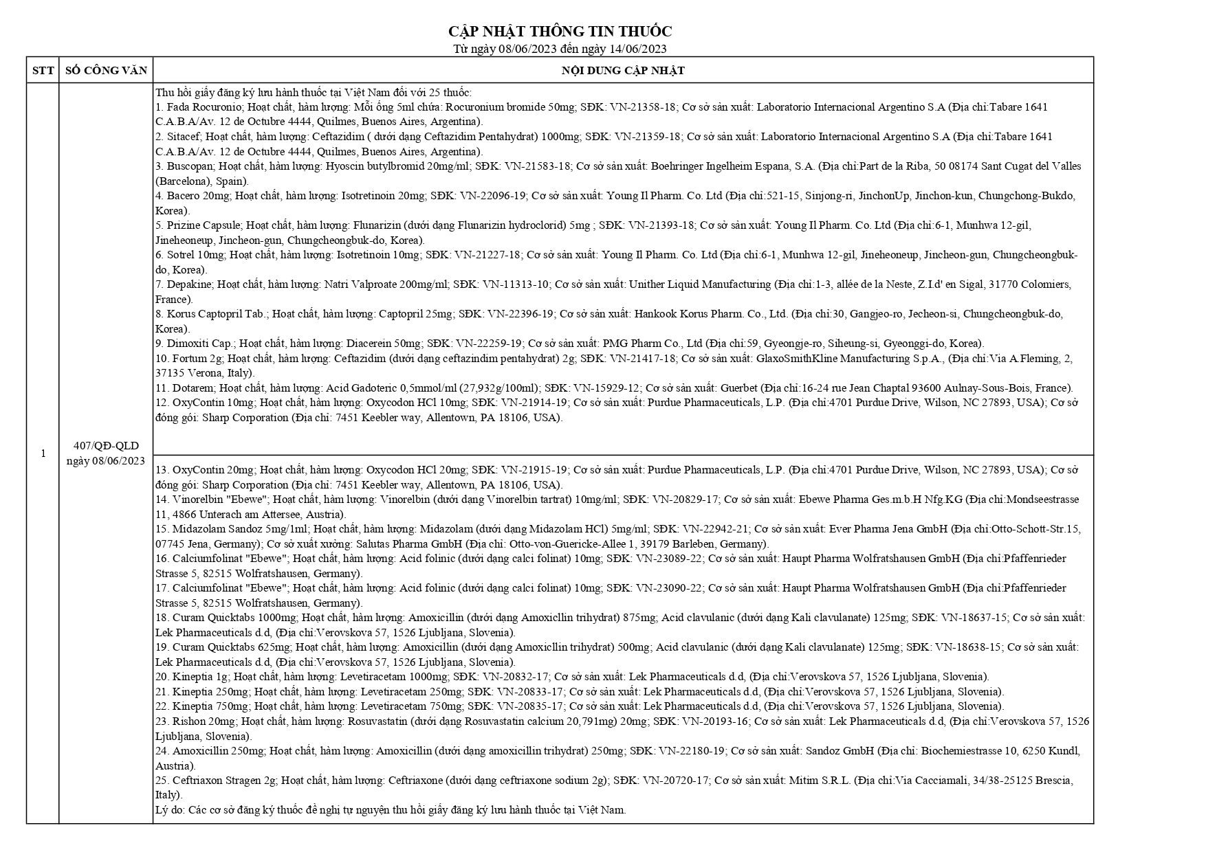 Cập nhật thông tin thuốc từ ngày 08-06-2023 đến ngày 14-06-2023