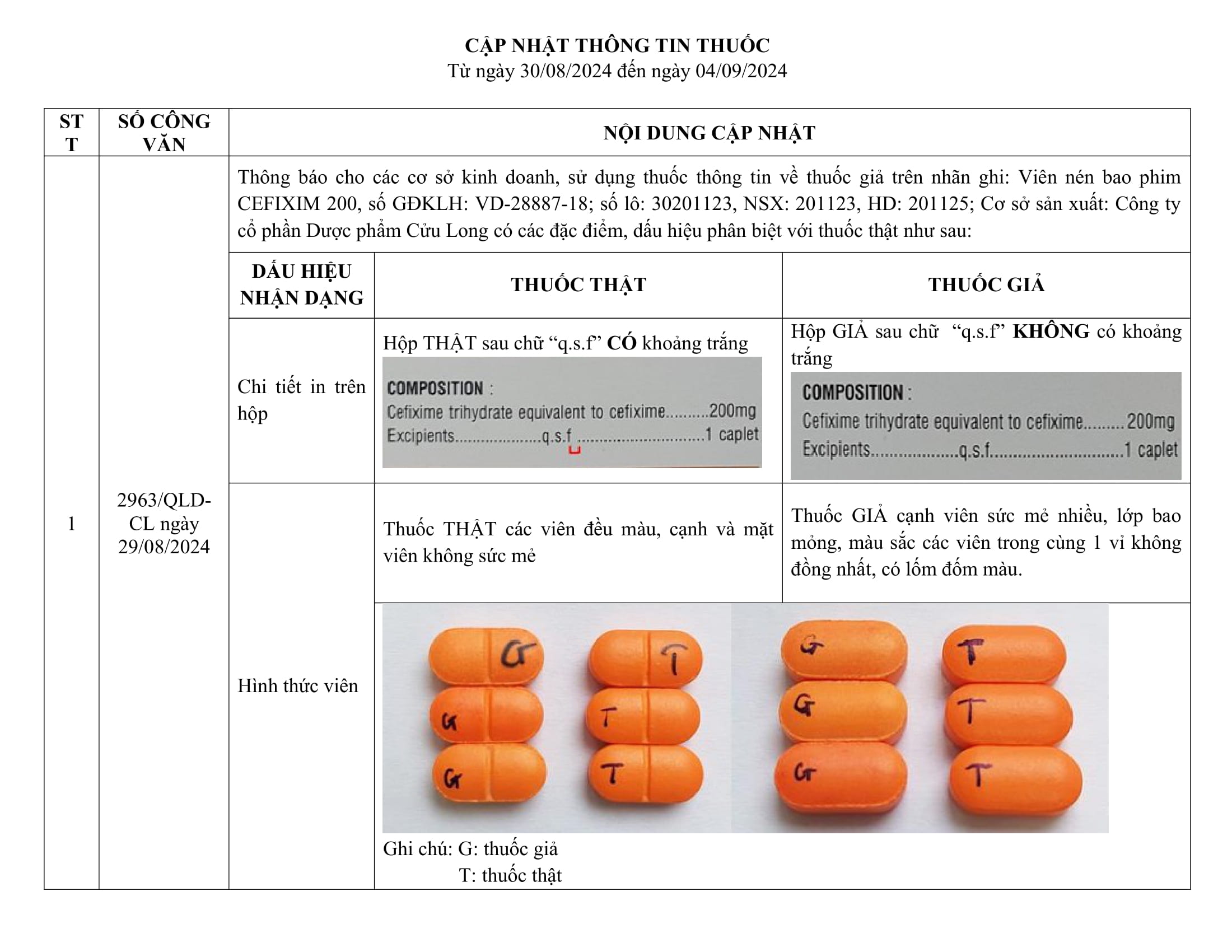 Cập nhật thông tin thuốc từ ngày 30/08/2024 đến ngày 04/09/2024