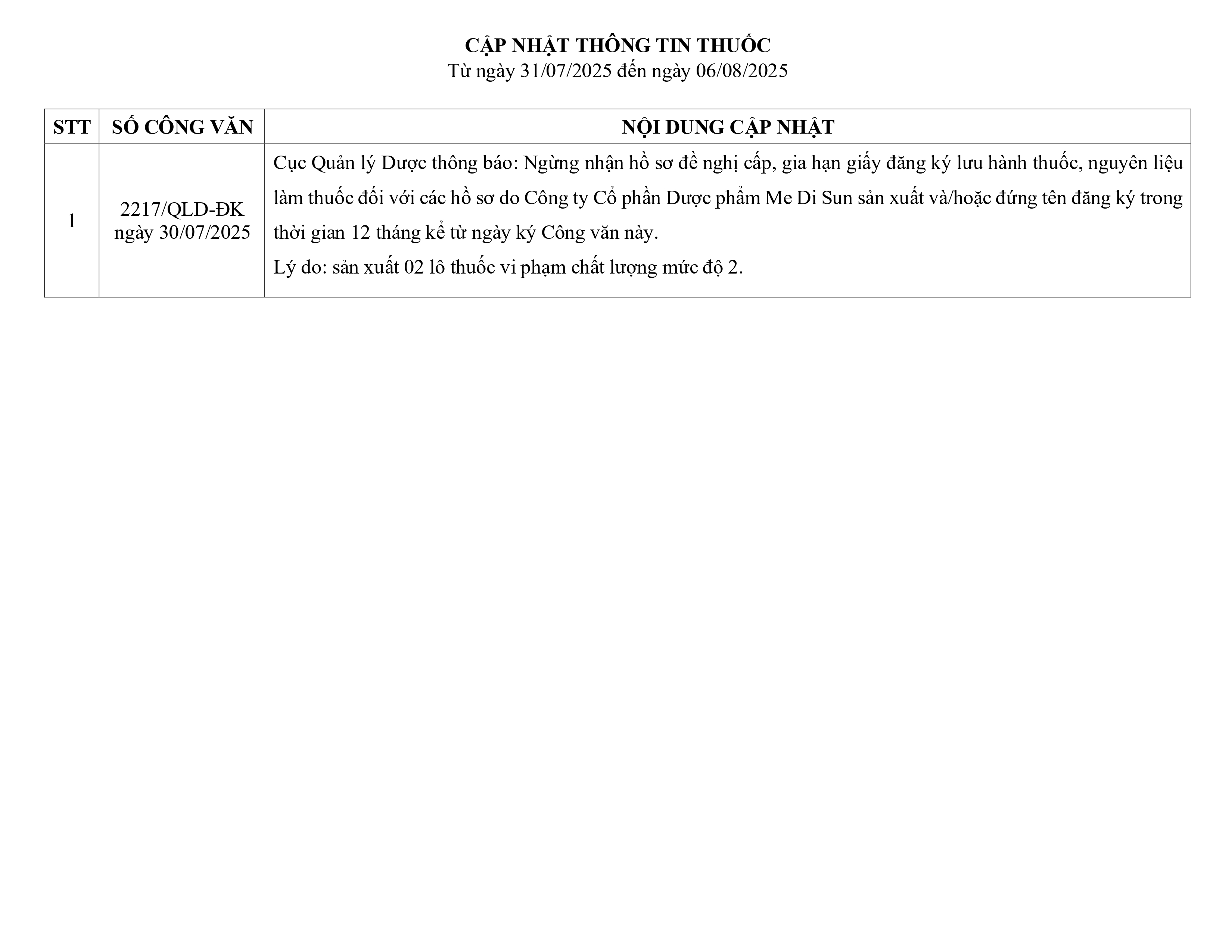 Cập nhật thông tin thuốc từ ngày 31/07/2025 đến 06/08/2025
