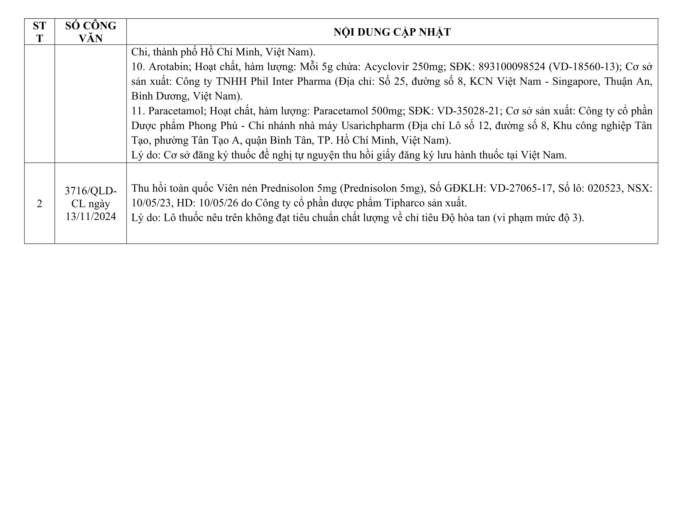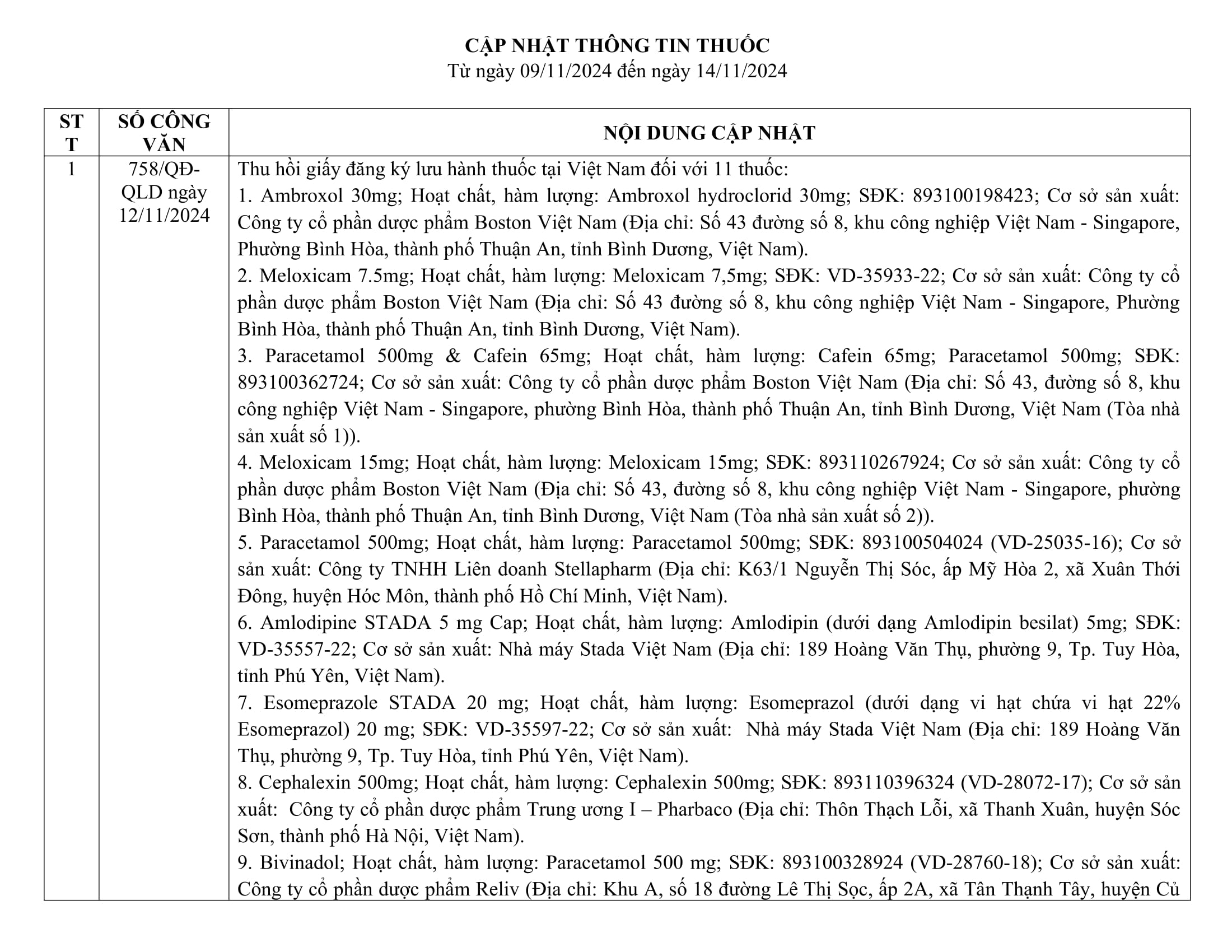 Cập nhật thông tin thuốc từ ngày 9/11/2024 đến ngày 14/11/2024