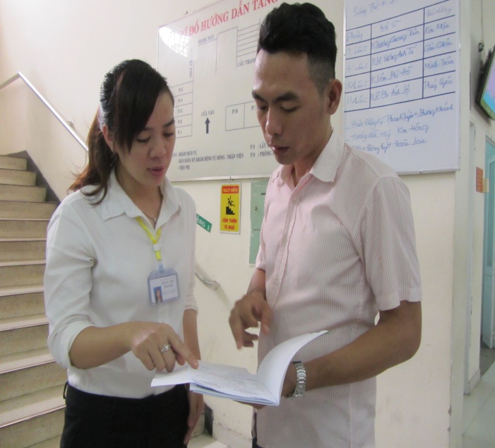 + Trong các hoạt động hỗ trợ Ngoại trú và thăm hỏi Nội trú, nhân viên Tổ cũng lồng ghép việc nhắc nhở NB, người nhà NB chú ý bảo quản tài sản, tư trang cá nhân hay lập tức thông báo với lực lượng nhân viên Bảo vệ khi thấy những đối tượng “khả nghi” lui tới khu vực nội trú… Hoặc thông tin thêm về các thủ tục giấy tờ, như đối với 1 trường hợp: BN ra về khi chưa hoàn thành “thủ tục xuất viện”, ngay khi nhận được thông tin, Tổ nhanh chóng liên hệ với người nhà NB đến làm thủ tục xuất viện, giải thích để NB hiểu rõ tầm quan trọng và lợi ích của NB khi hoàn thành các thủ tục trước khi xuất viện.