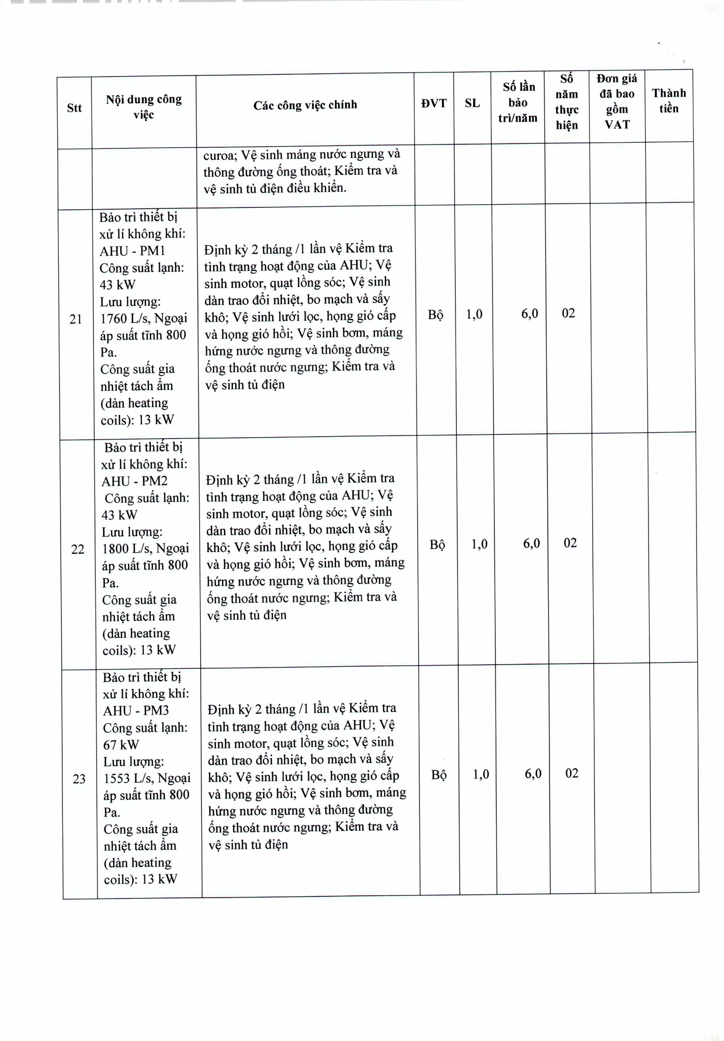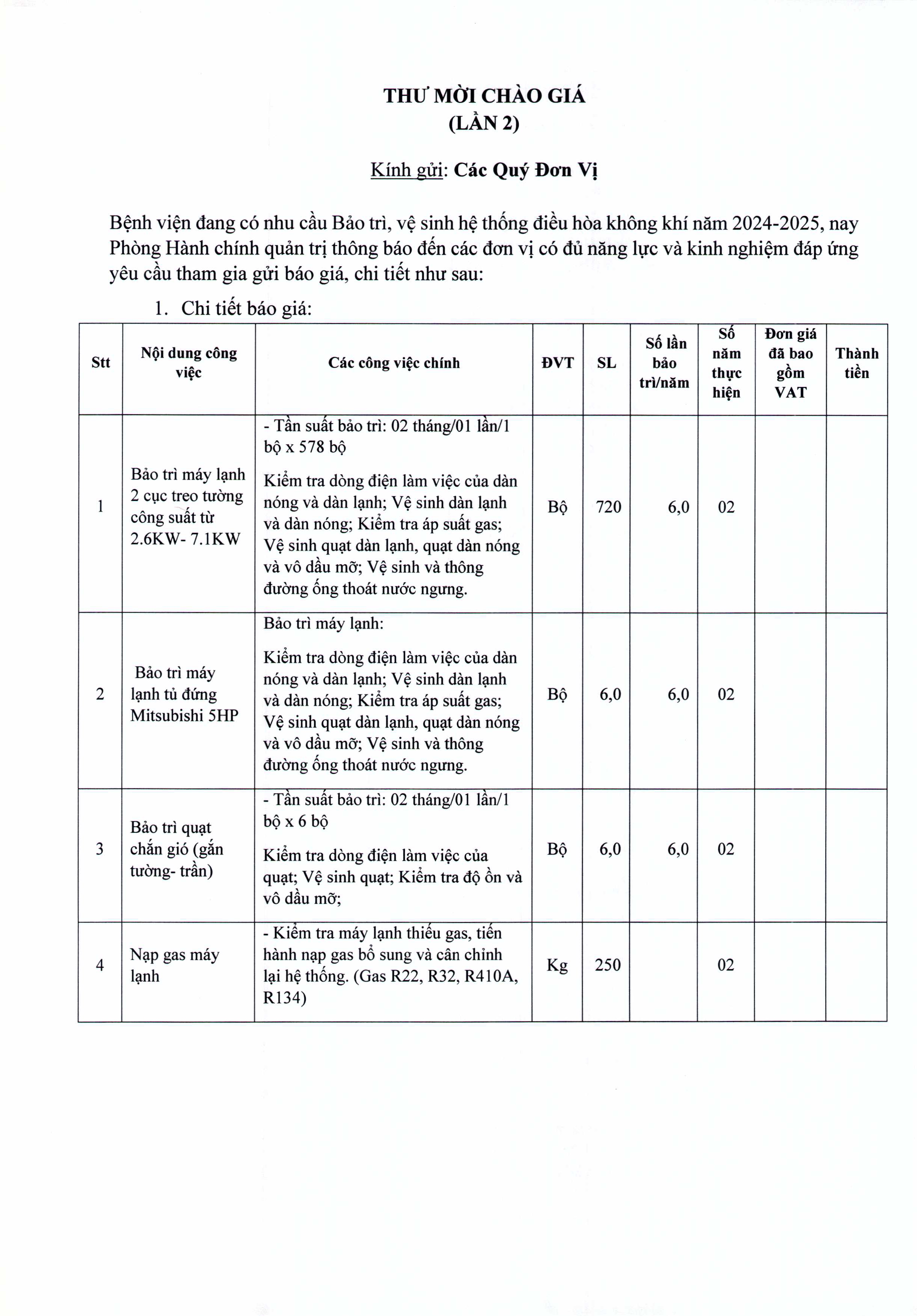 Thư mời chào giá Bệnh viện đang có nhu cầu bảo trì, vệ sinh hệ thống điều hoà không khí năm 2024-2025 (lần 2)