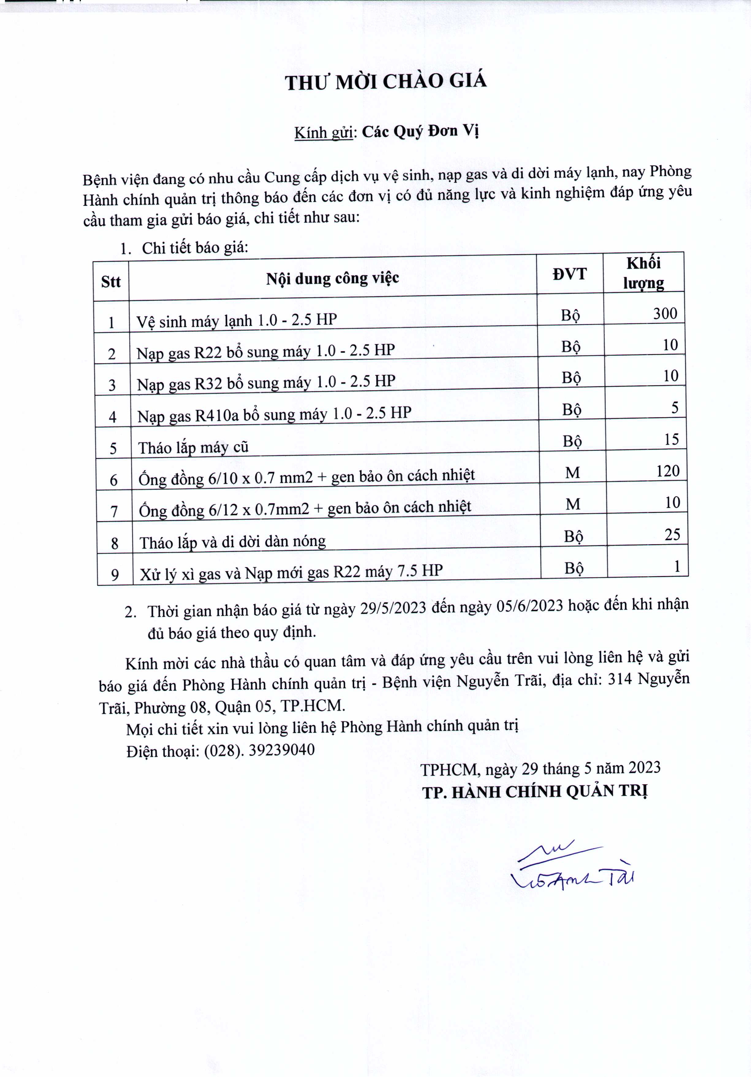 Thư mời chào giá Bệnh viện đang có nhu cầu cung cấp dịch vụ vệ sinh, nạp gas và di dời máy lạnh