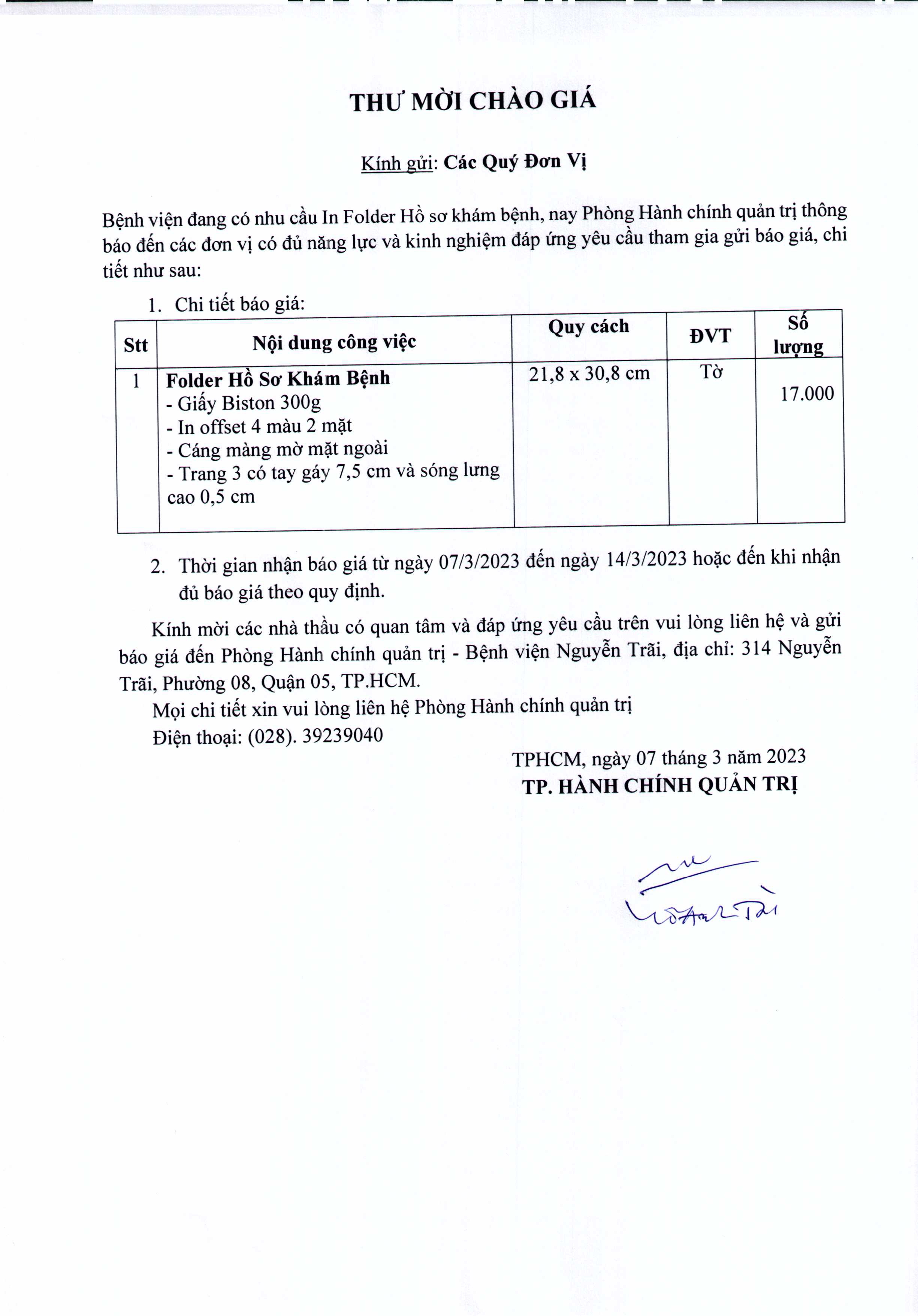 Thư mời chào giá Bệnh viện đang có nhu cầu In Folder hồ sơ khám bệnh