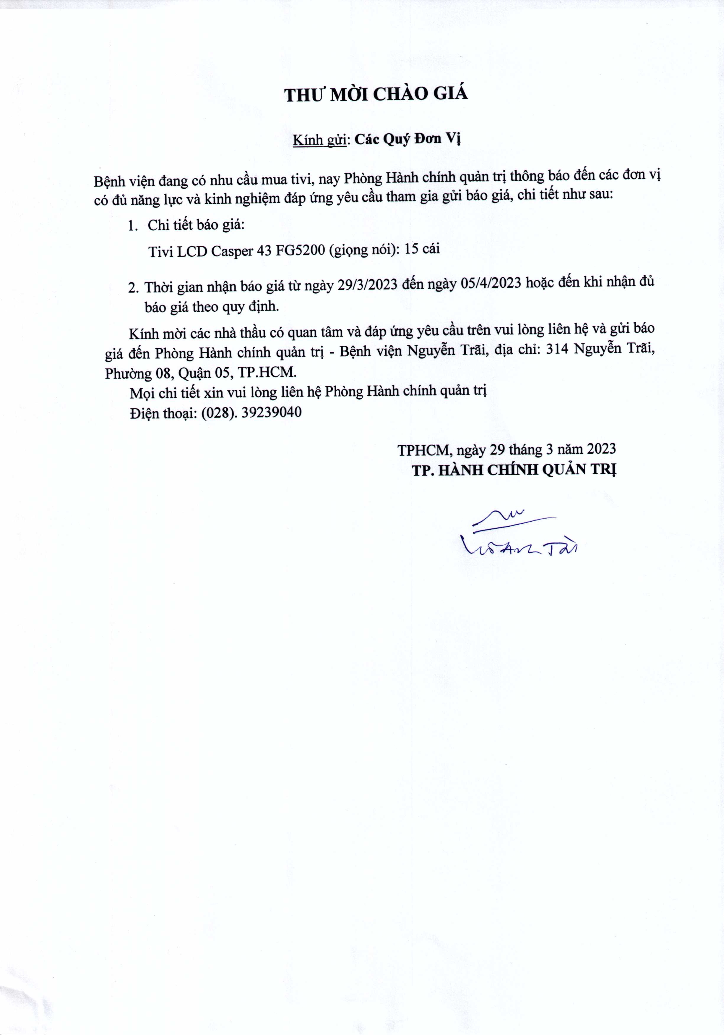 Thư mời chào giá Bệnh viện đang có nhu cầu mua tivi