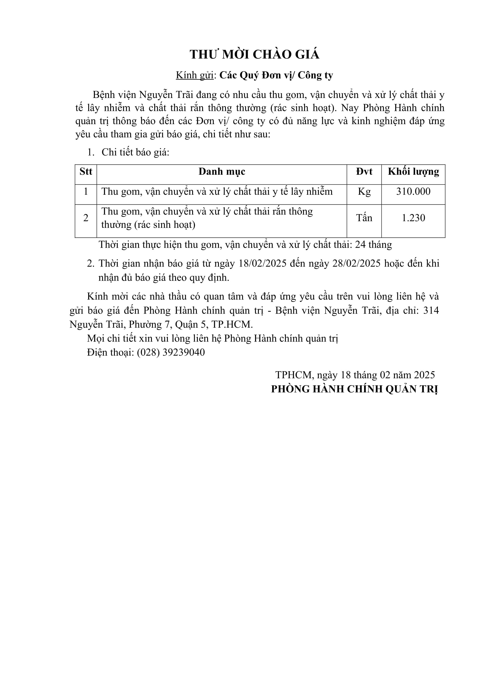 Thư mời chào giá Bệnh viện Nguyễn Trãi đang có nhu cầu thu gom, vận chuyển và xử lý chất thải y tế lây nhiễm và chất thải rắn thông thường (rác sinh hoạt)
