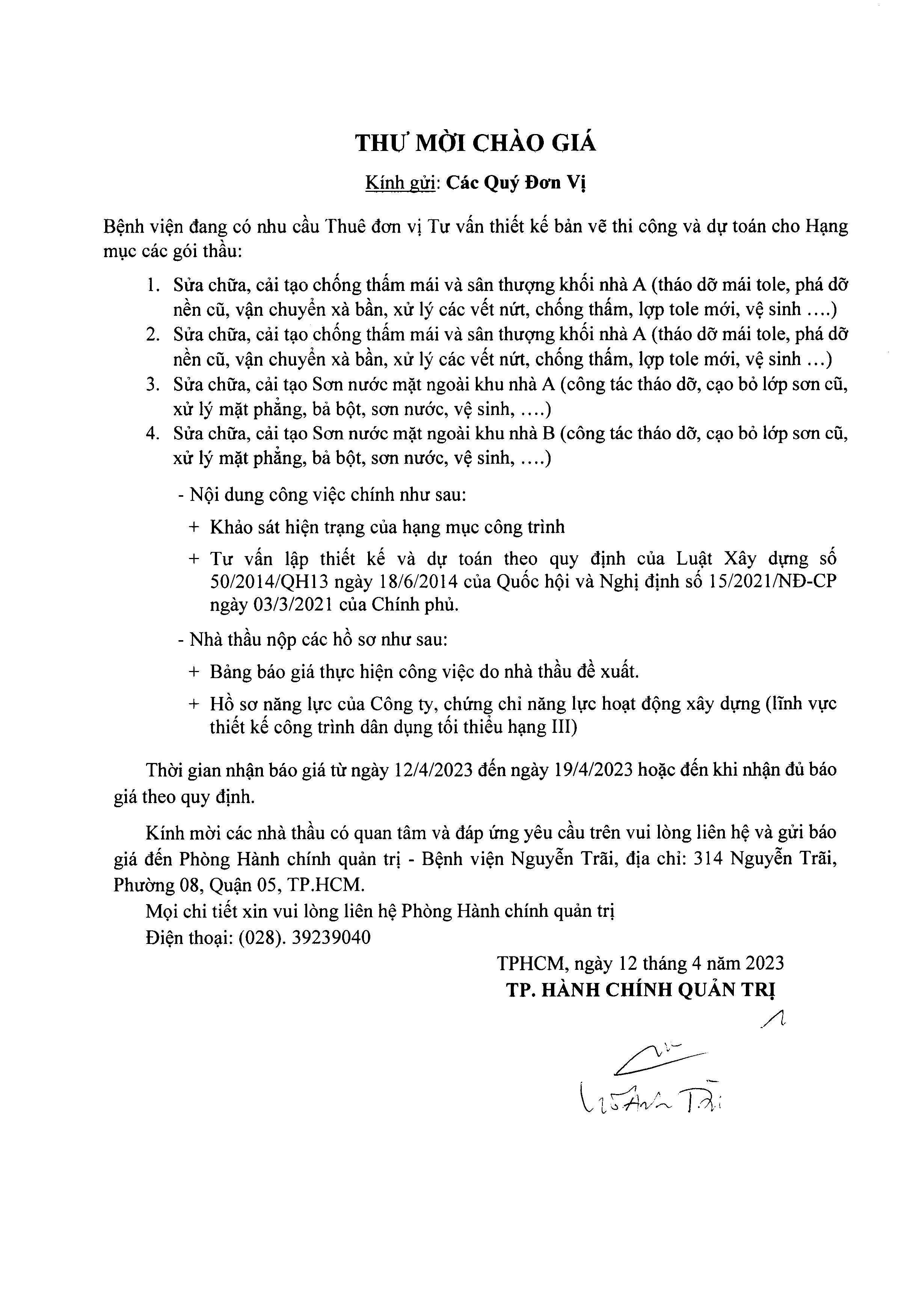 Thư mời chào giá bệnh viện Nguyễn Trãi đang có nhu cầu thuê đơn vị tư vấn thiết và bản vẽ thi công và dự toán cho Hạng mục các gói thầu