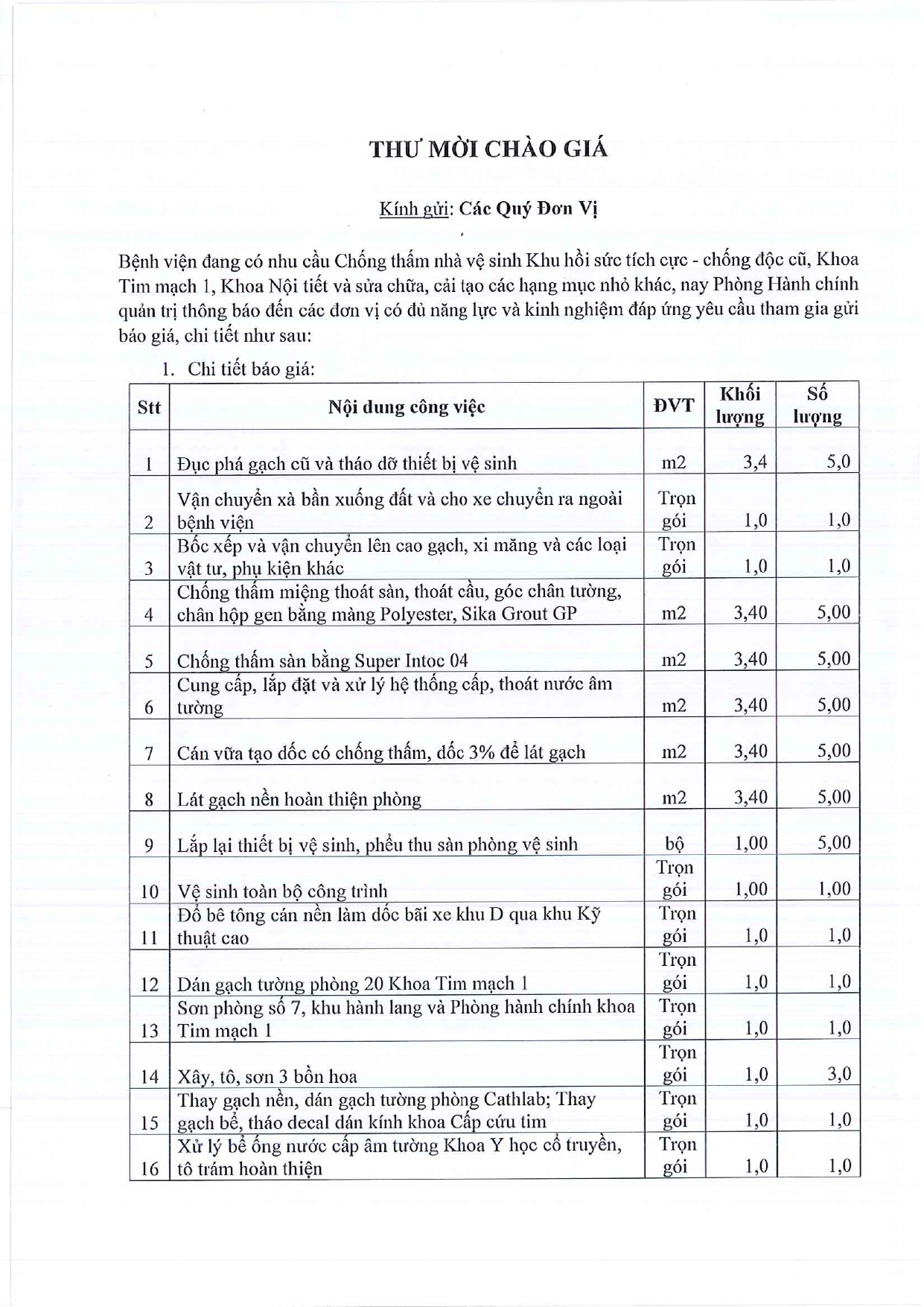 Thư mời chào giá chống thấm nhà vệ sinh khu Hồi sức tích cực- Chống độc cũ, Khoa Tim mạch 1 và Khoa Nội tiết, sửa chữa, cải tạo các hạng mục nhỏ khác