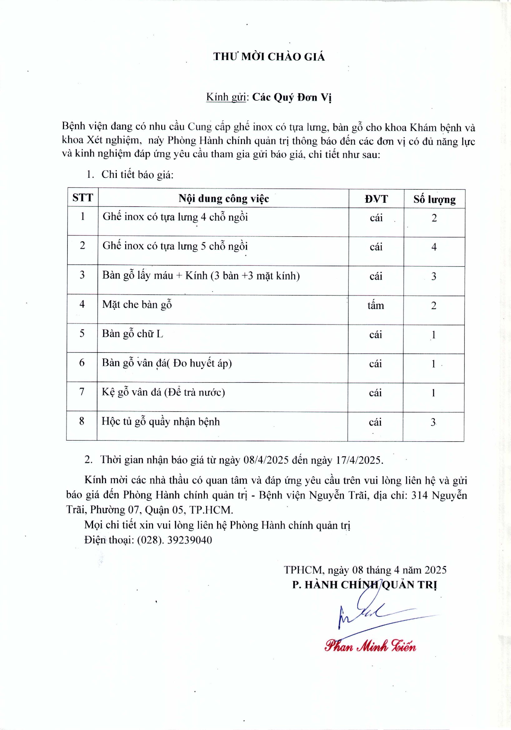 Thư mời chào giá Cung cấp ghế inox có tựa lưng, bàn gỗ cho khoa Khám bệnh và khoa xét nghiệm