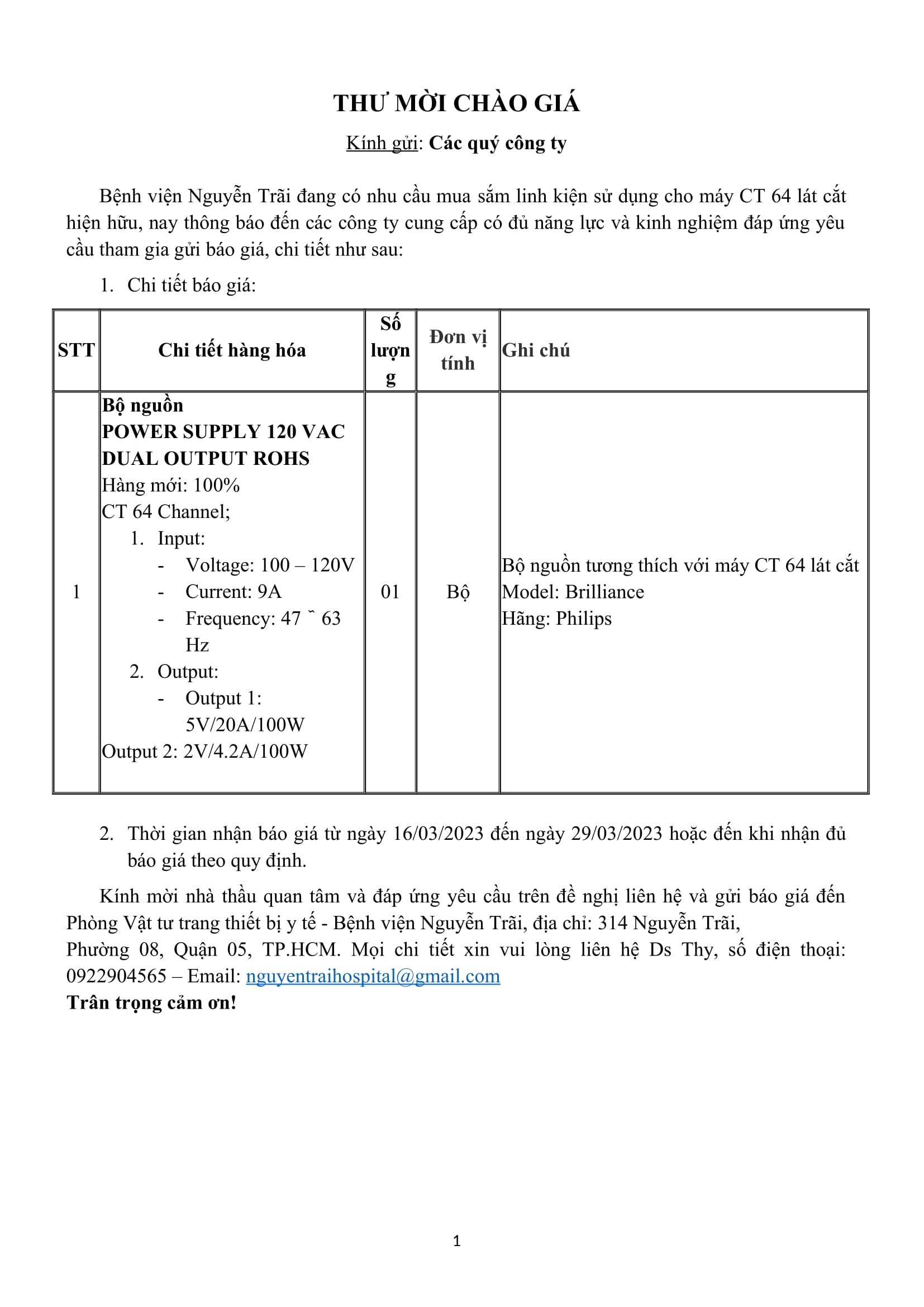 Thư mời chào giá mua sắm linh kiện sử dụng cho máy CT 64 lát cắt hiện hữu