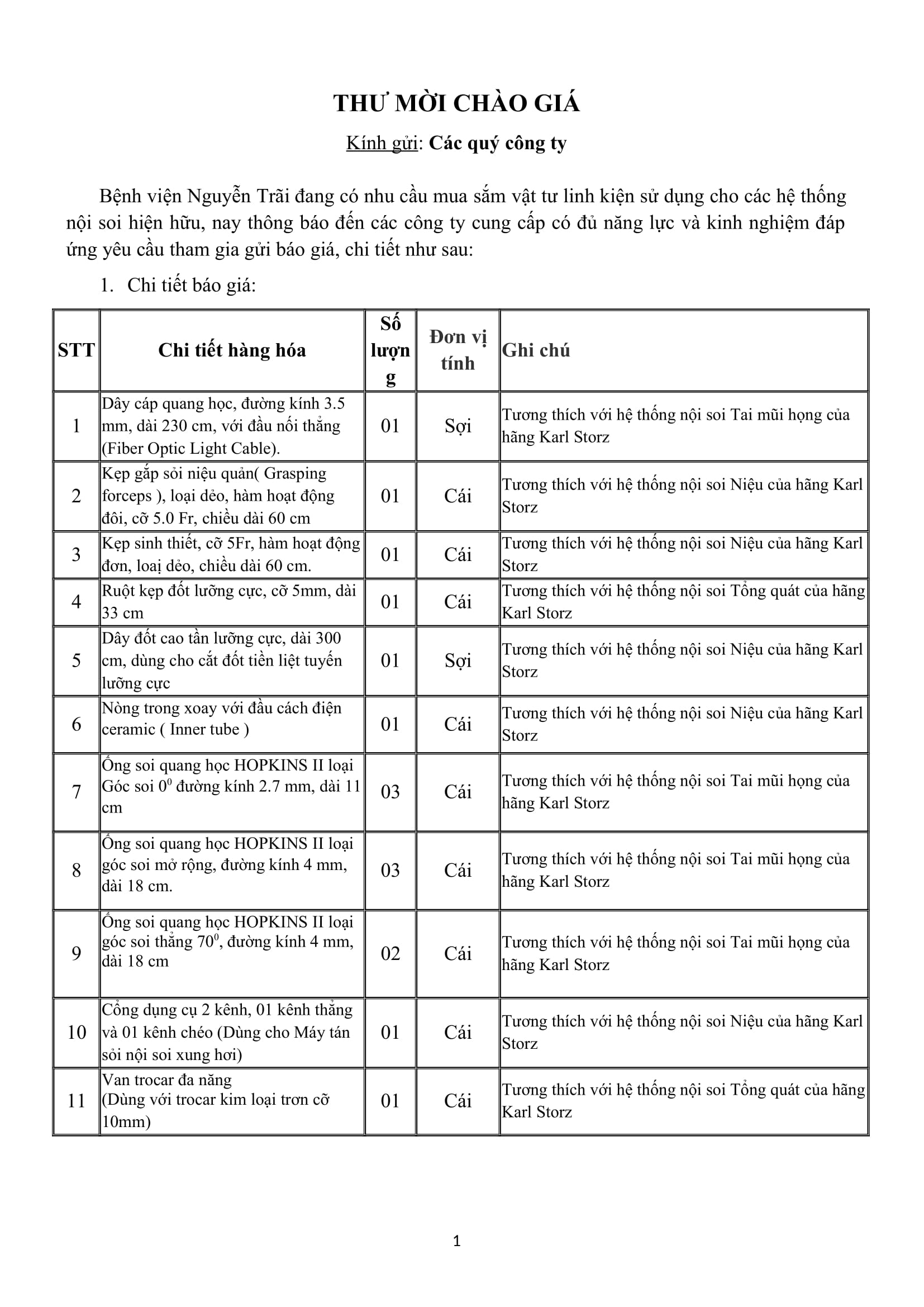 Thư mời chào giá mua sắm vật tư linh kiện sử dụng cho các hệ thống nội soi hiện hữu