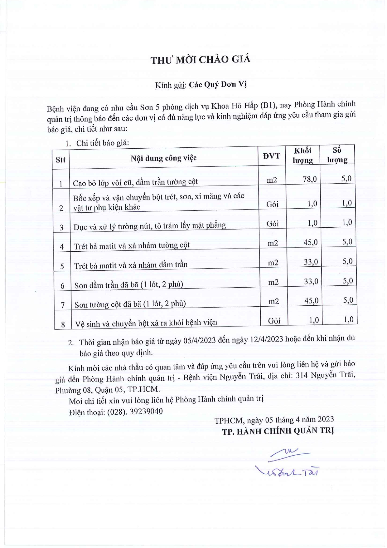 Thư mời chào giá sơn 5 phòng dịch vụ Khoa Hô hấp (B1)