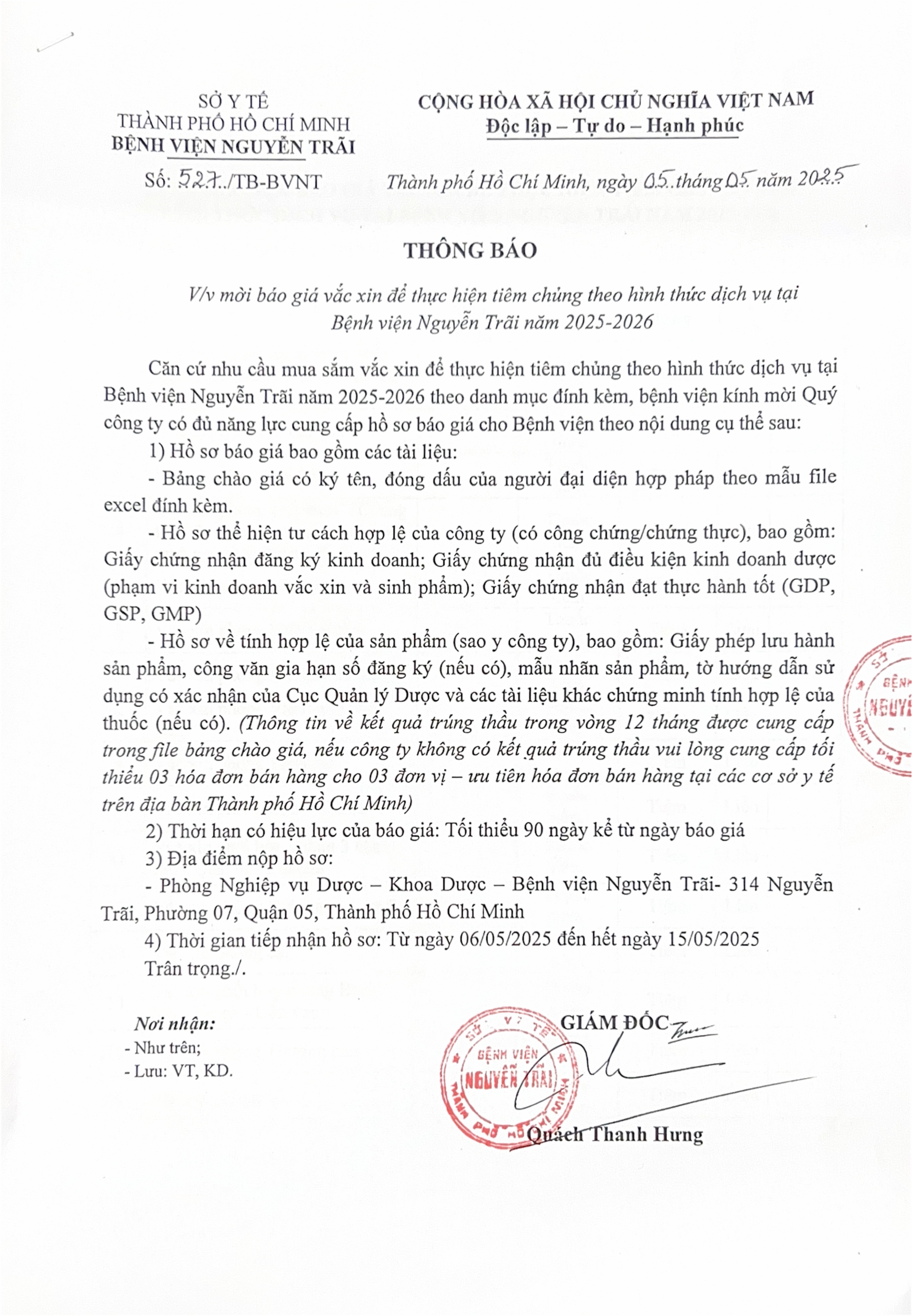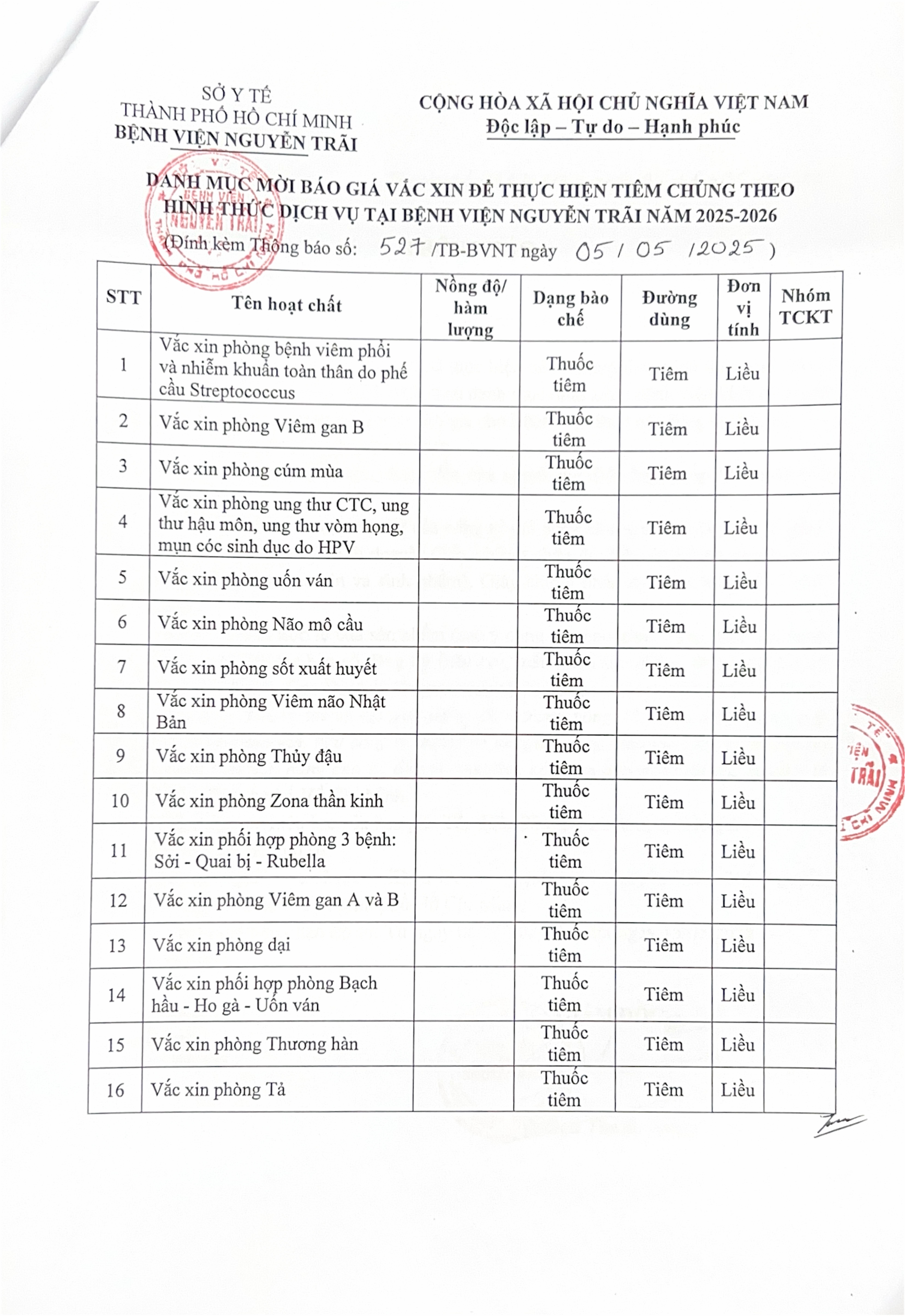 Invitation to submit bids for vaccines to be administered as a service at Nguyen Trai Hospital in 2025-2026.
