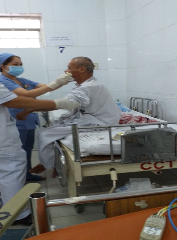 Hộ lý Hồng đang vệ sinh răng miệng cho người bệnh