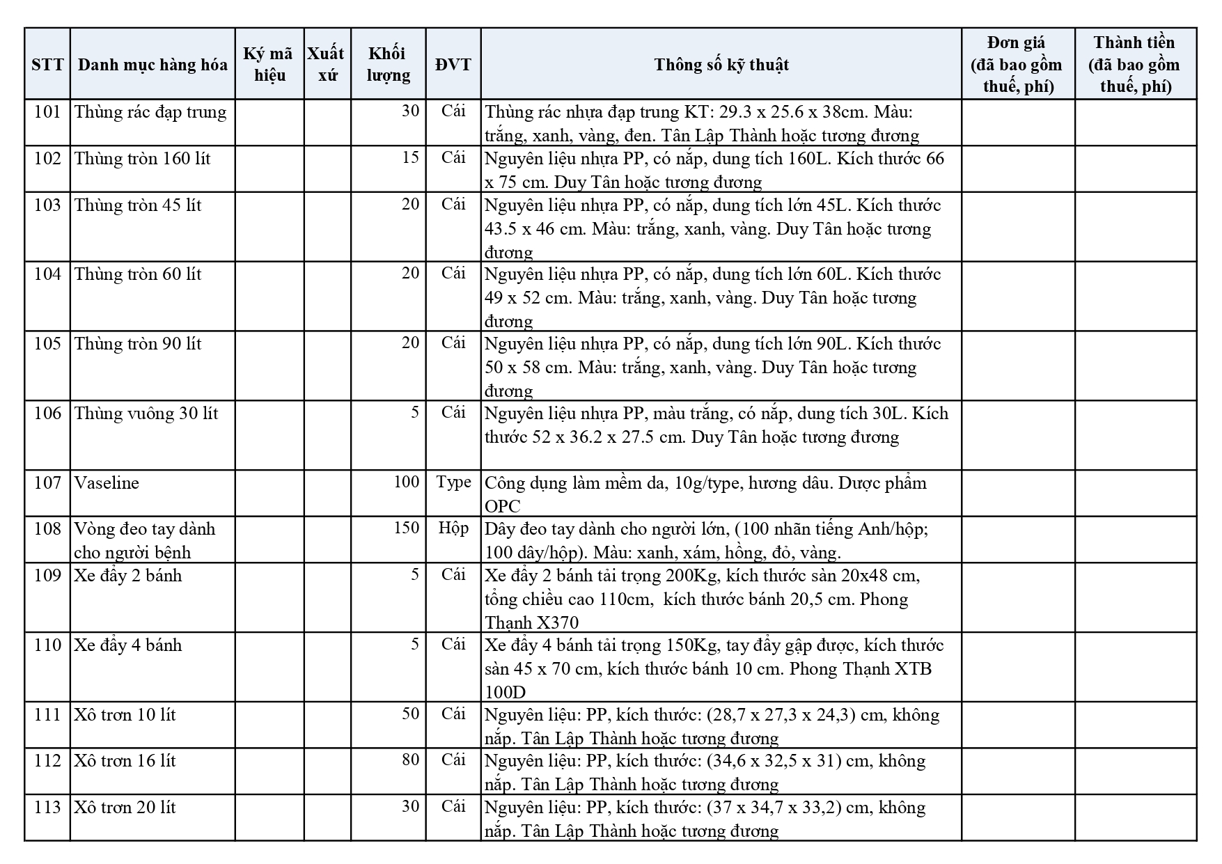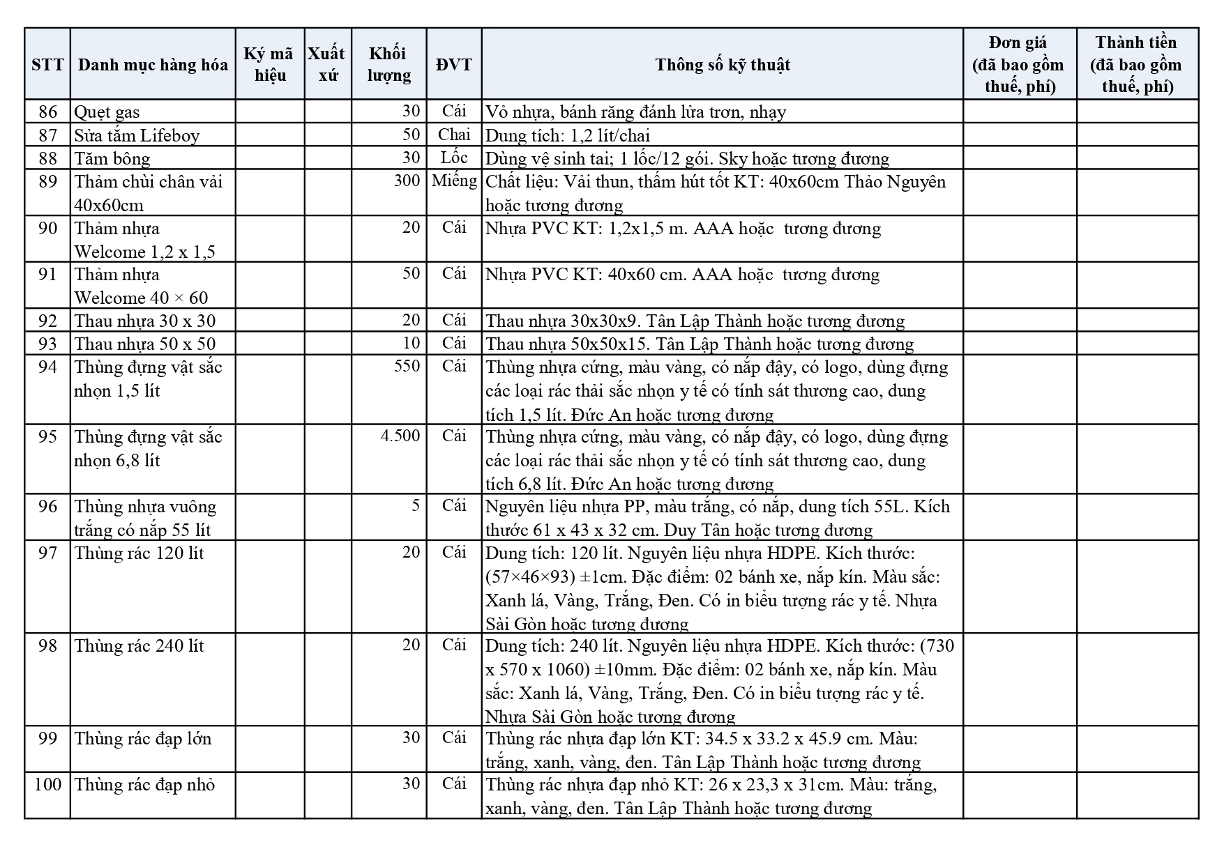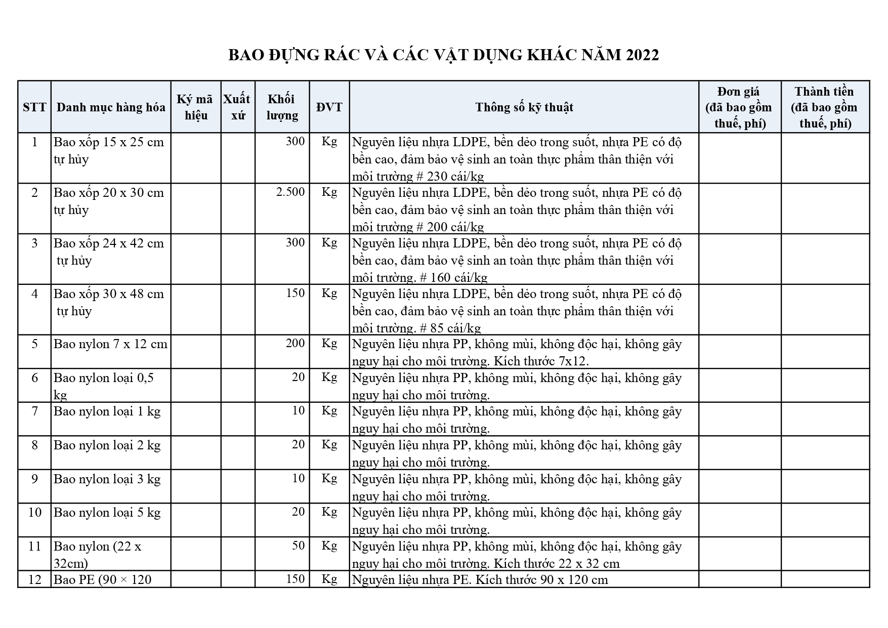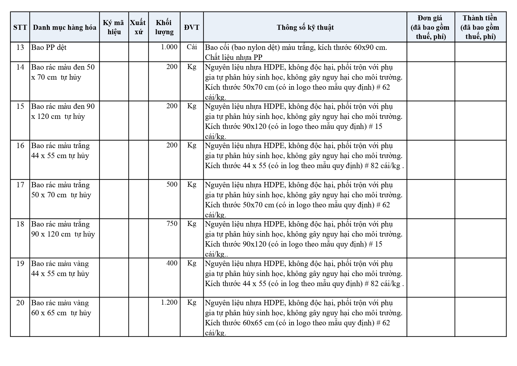 Thư mời chào giá bao đựng rác và các vật dụng khác