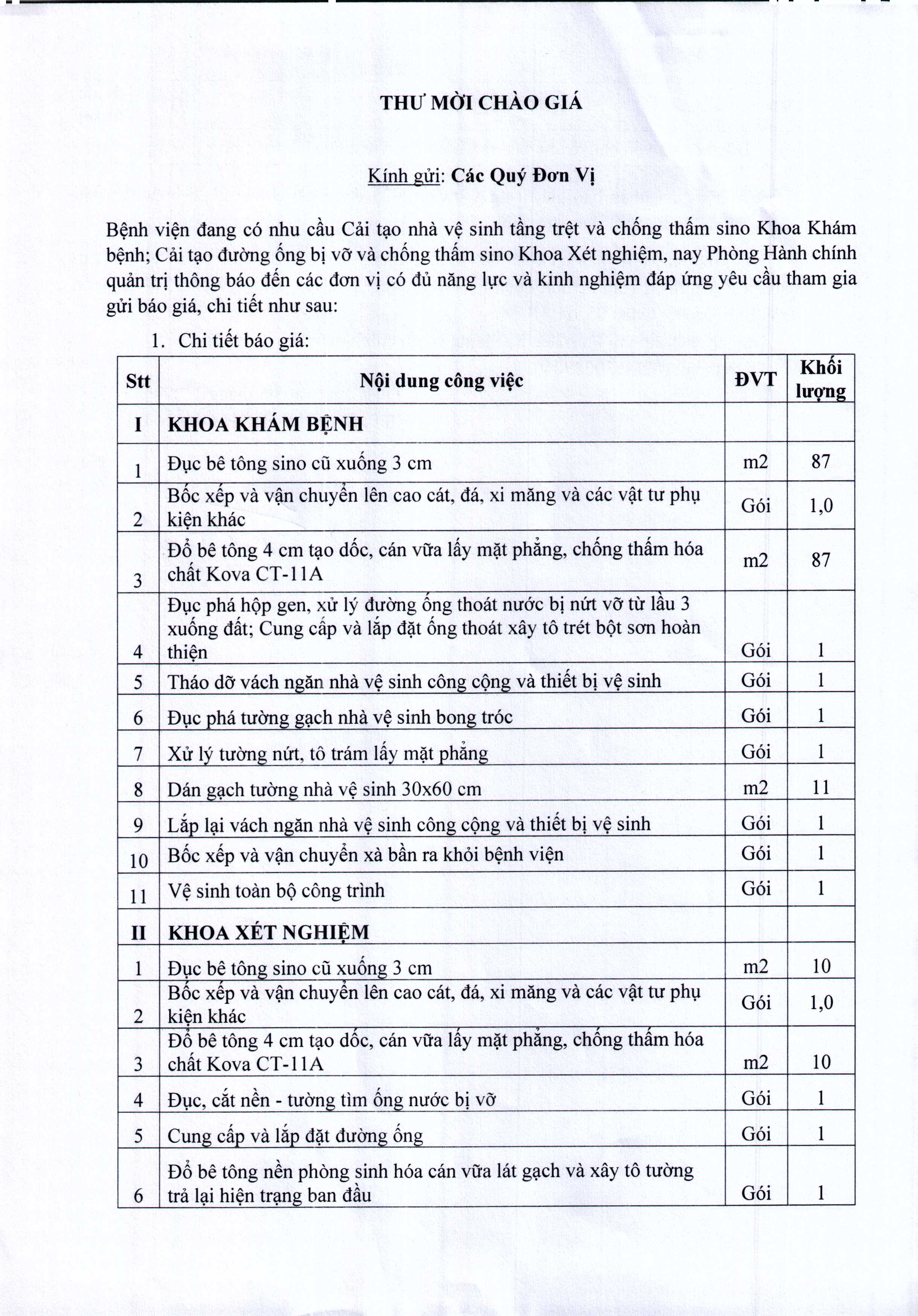 Thư mời chào giá Bệnh viện đang có nhu cầu cải tạo nhà vệ sinh tầng trệt và chống thấm sino Khoa Khám bệnh và Khoa Xét nghiệm