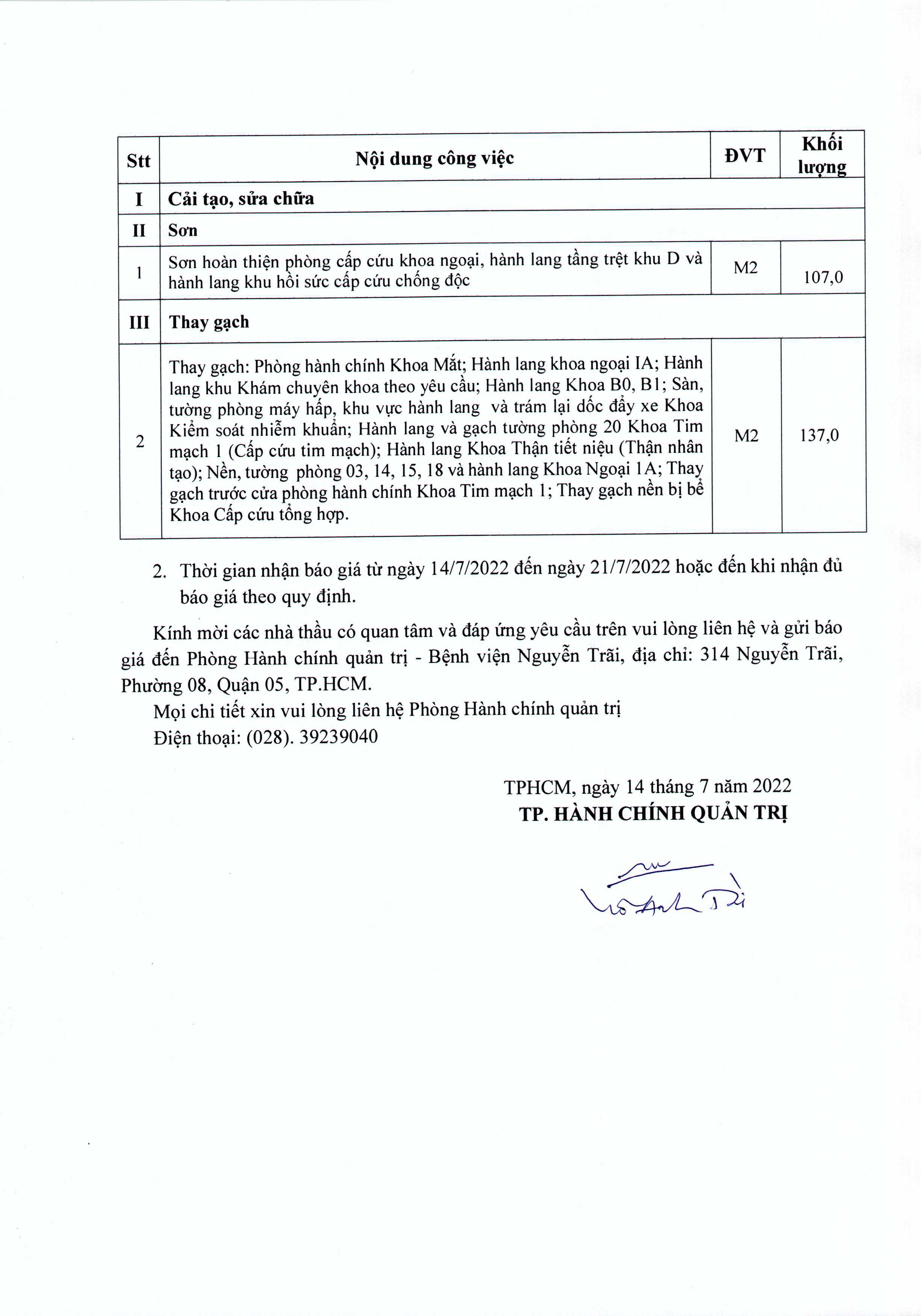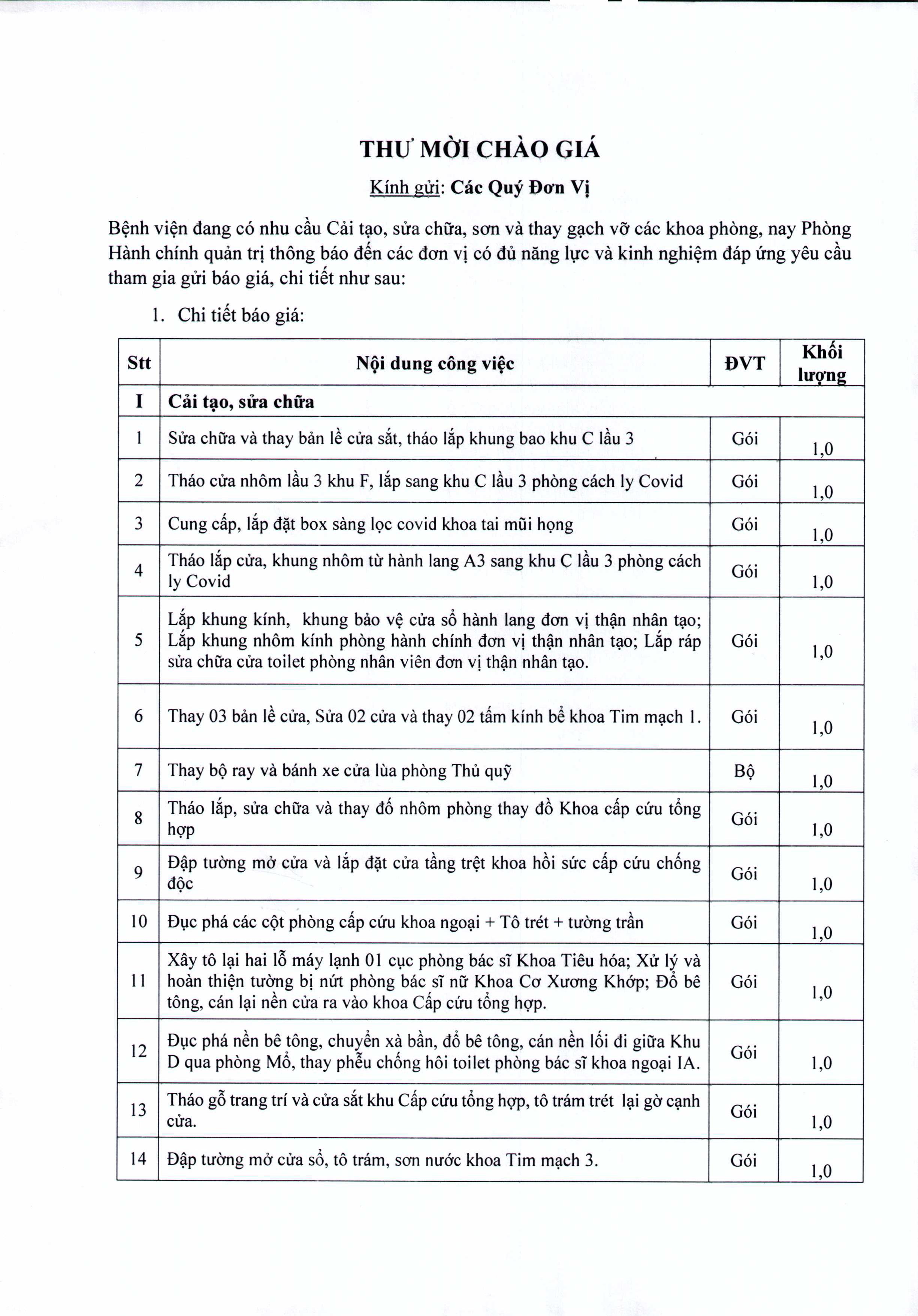 Thư mời chào giá Bệnh viện đang có nhu cầu cải tạo, sửa chữa, sơn và thay gạch vỡ các khoa phòng