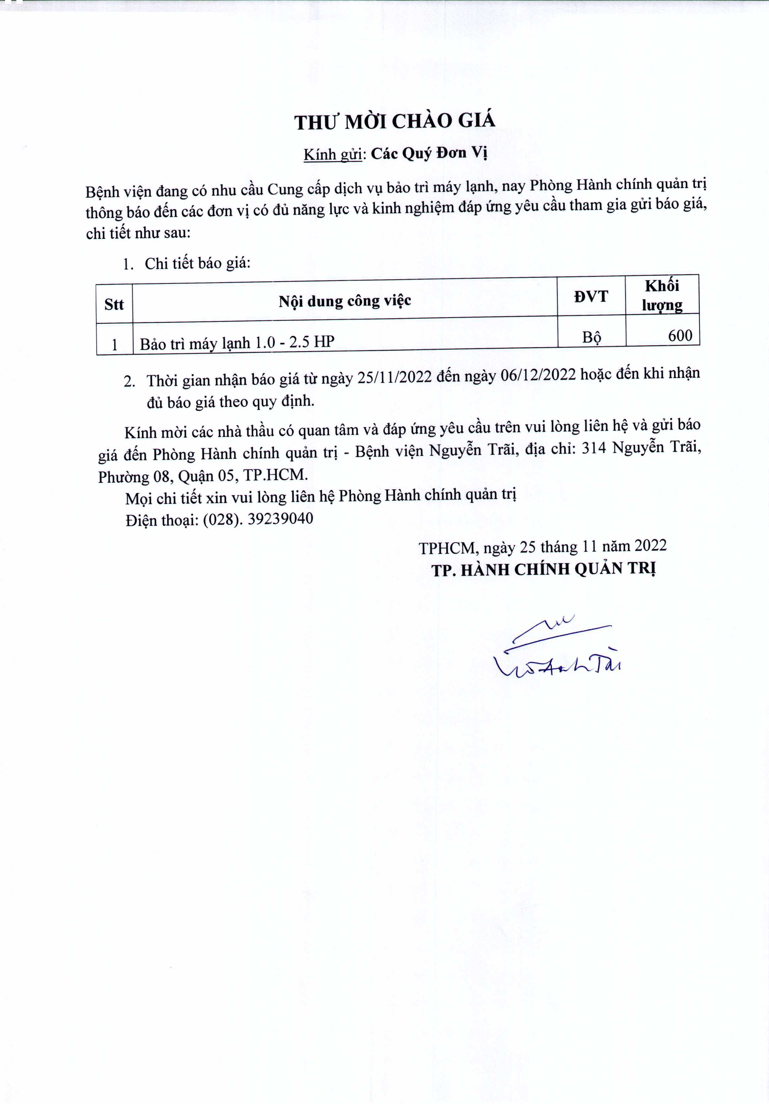 Thư mời chào giá Bệnh viện đang có nhu cầu cung cấp dịch vụ bảo trì máy lạnh