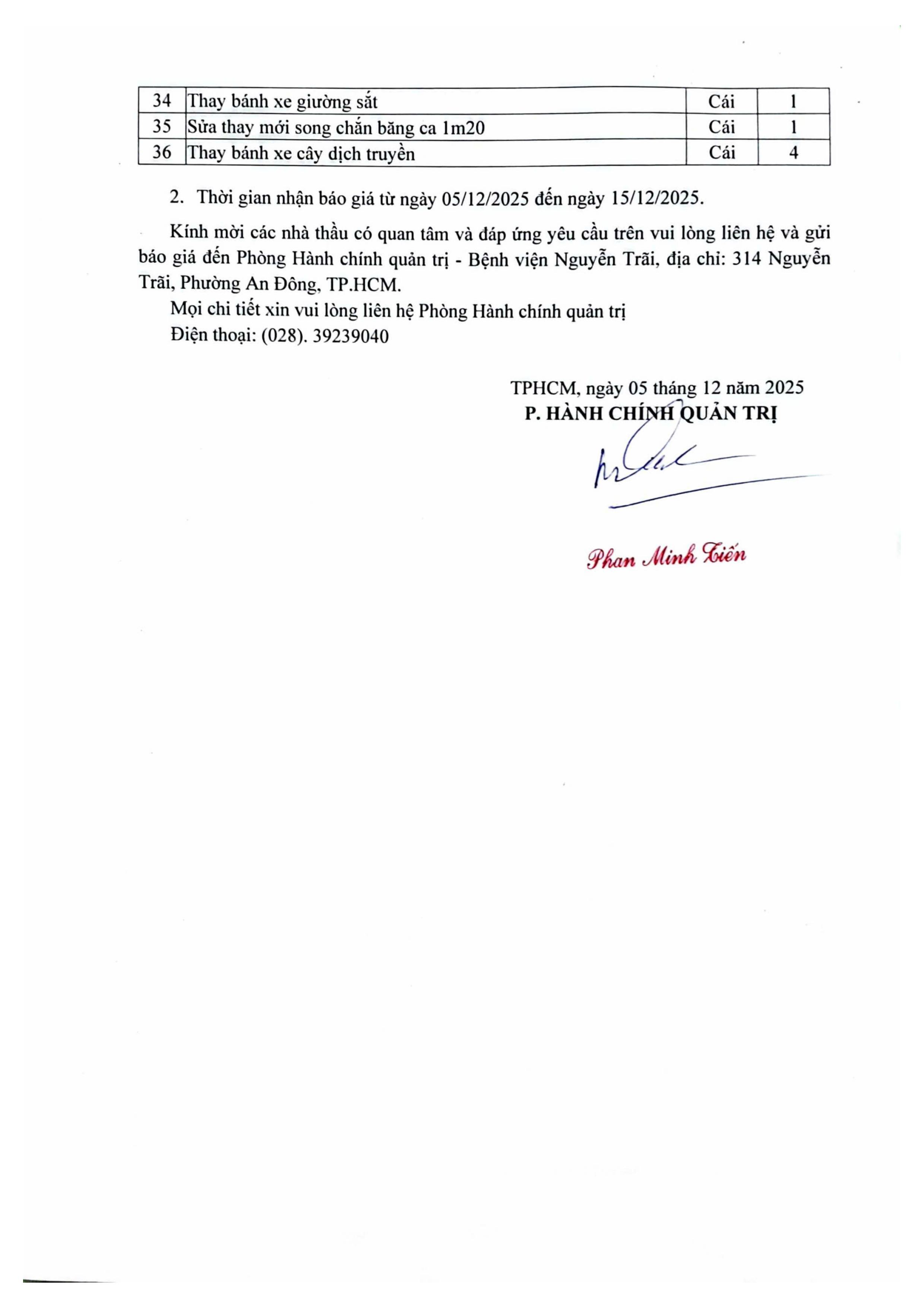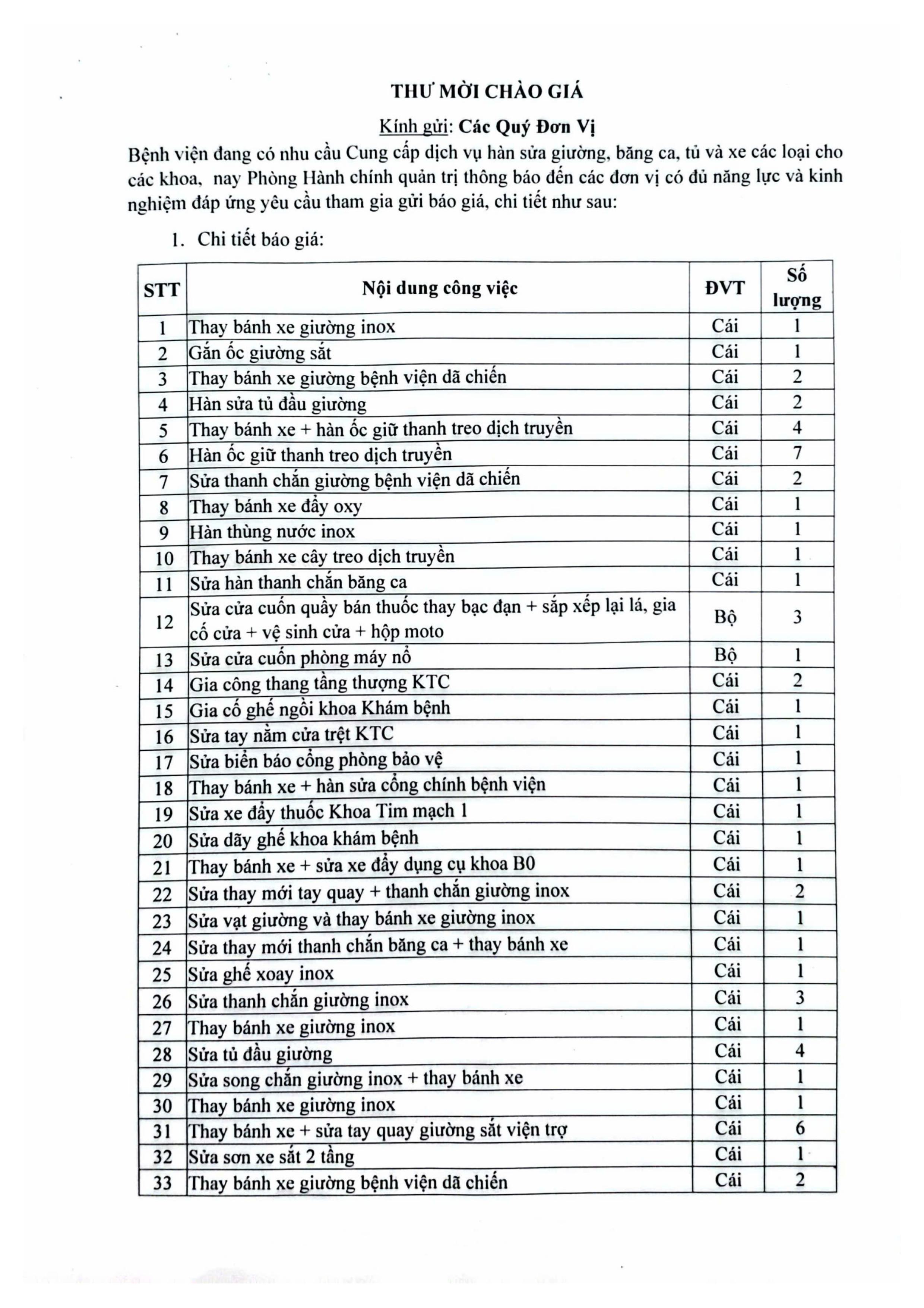 Thư mời chào giá Bệnh viện đang có nhu cầu Cung cấp hàn sửa giường, băng ca,tủ và xe các loại cho các khoa
