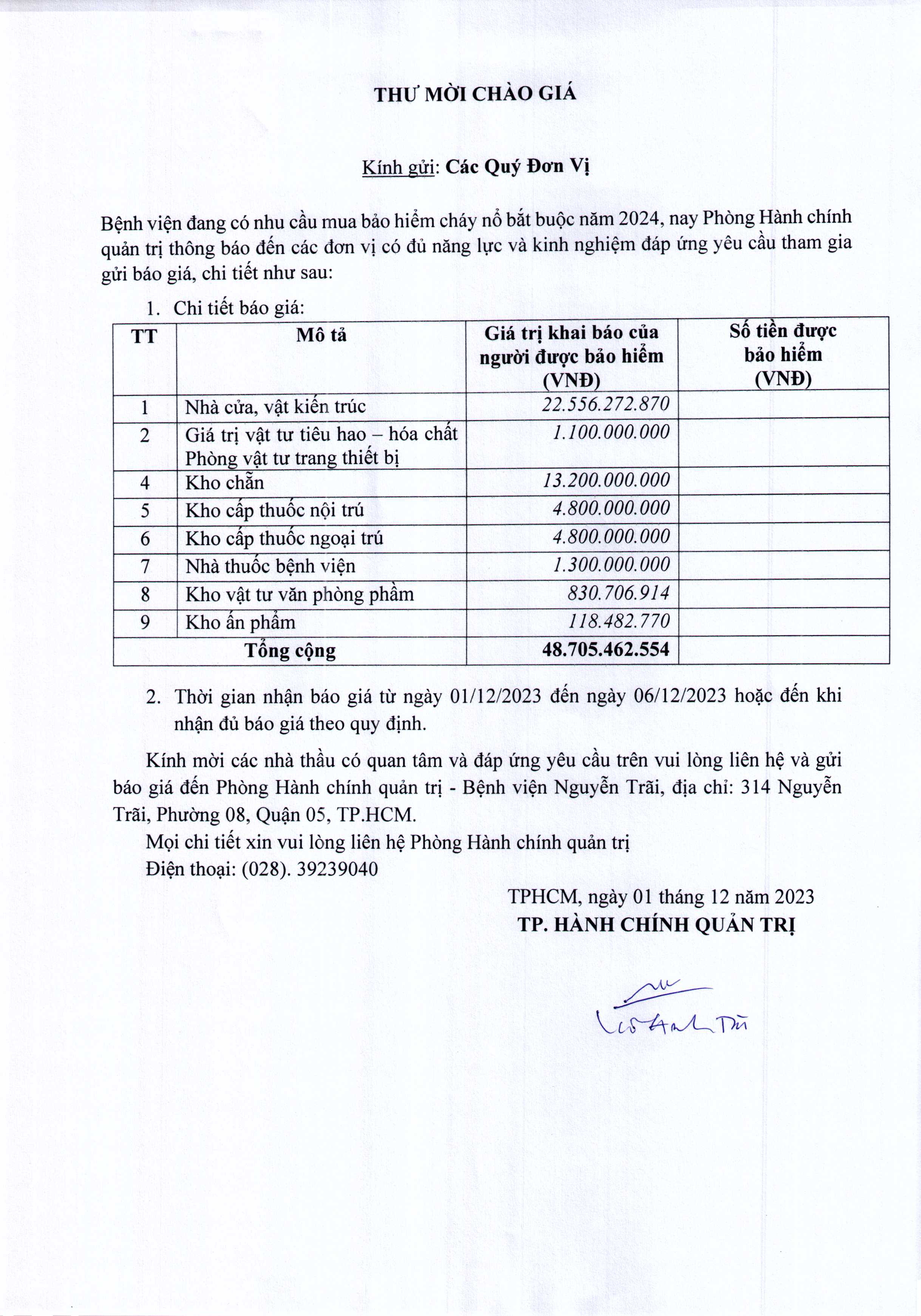 Thư mời chào giá Bệnh viện đang có nhu cầu mua bảo hiểm cháy nổ bắt buộc năm 2024
