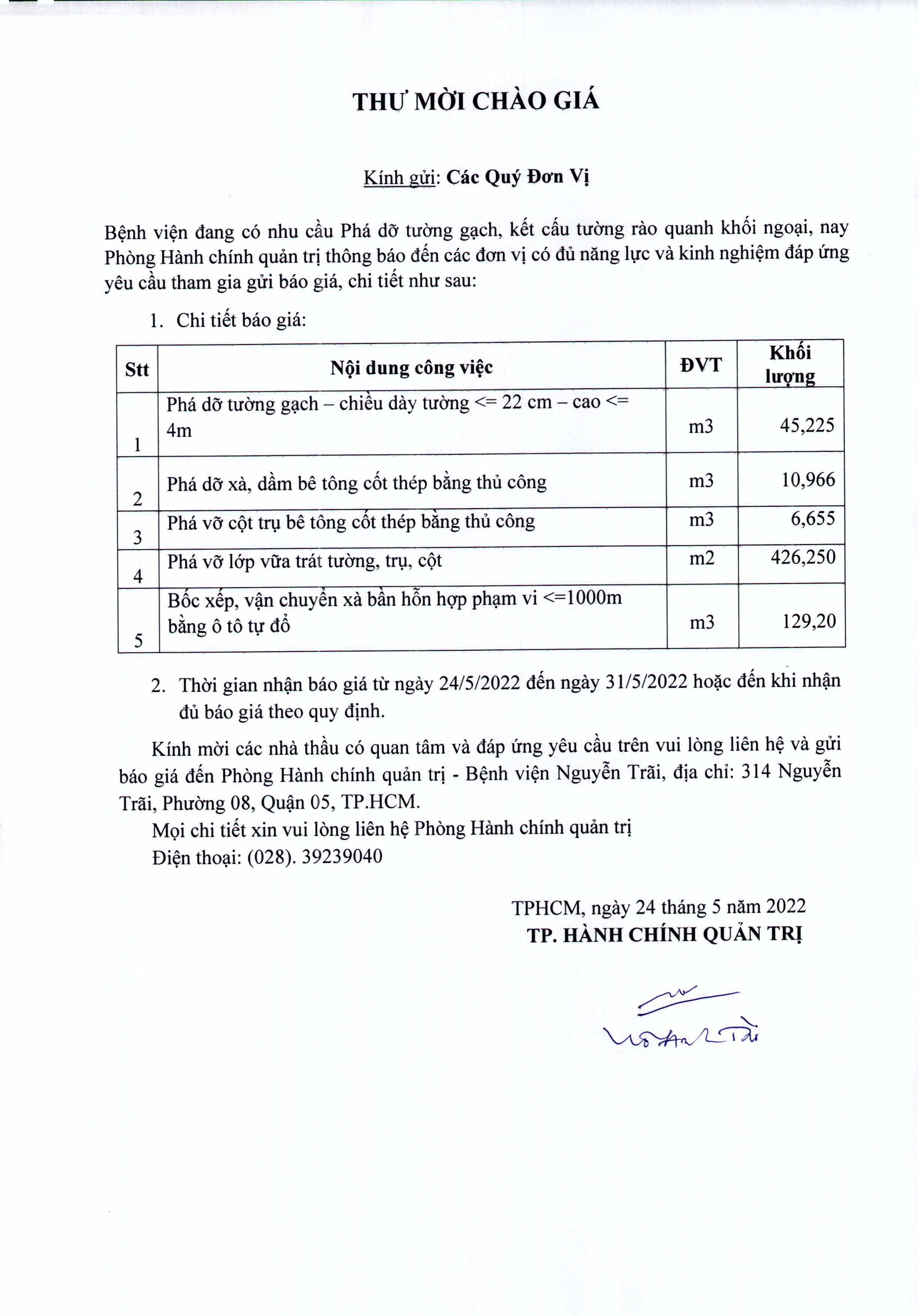 Thư mời chào giá Bệnh viện đang có nhu cầu phá dỡ tường gạch, kết cấu tường rào quanh khối ngoại