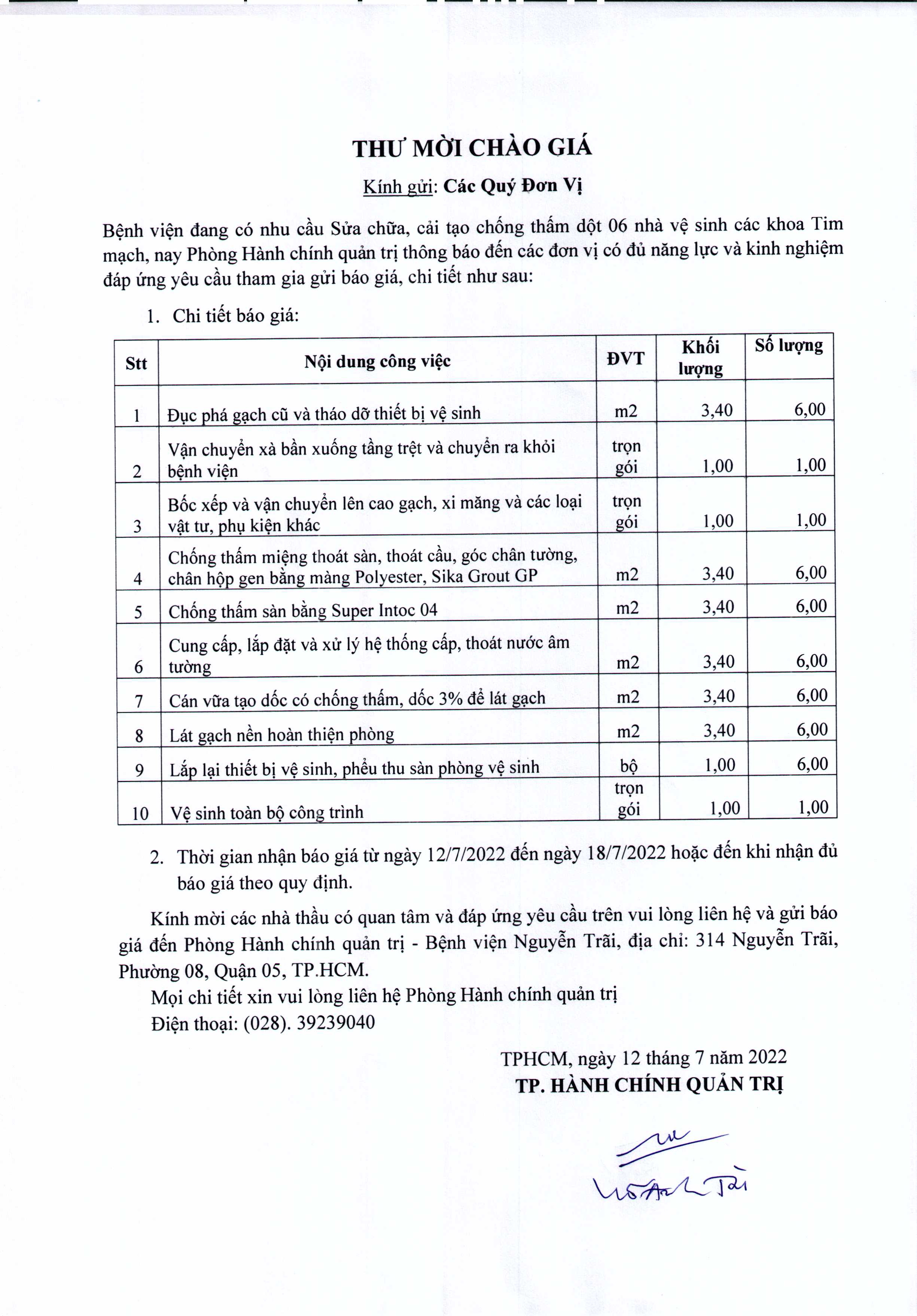 Thư mời chào giá Bệnh viện đang có nhu cầu sửa chữa, cải tạo chống thấm dột 06 nhà vệ sinh các khoa Tim mạch