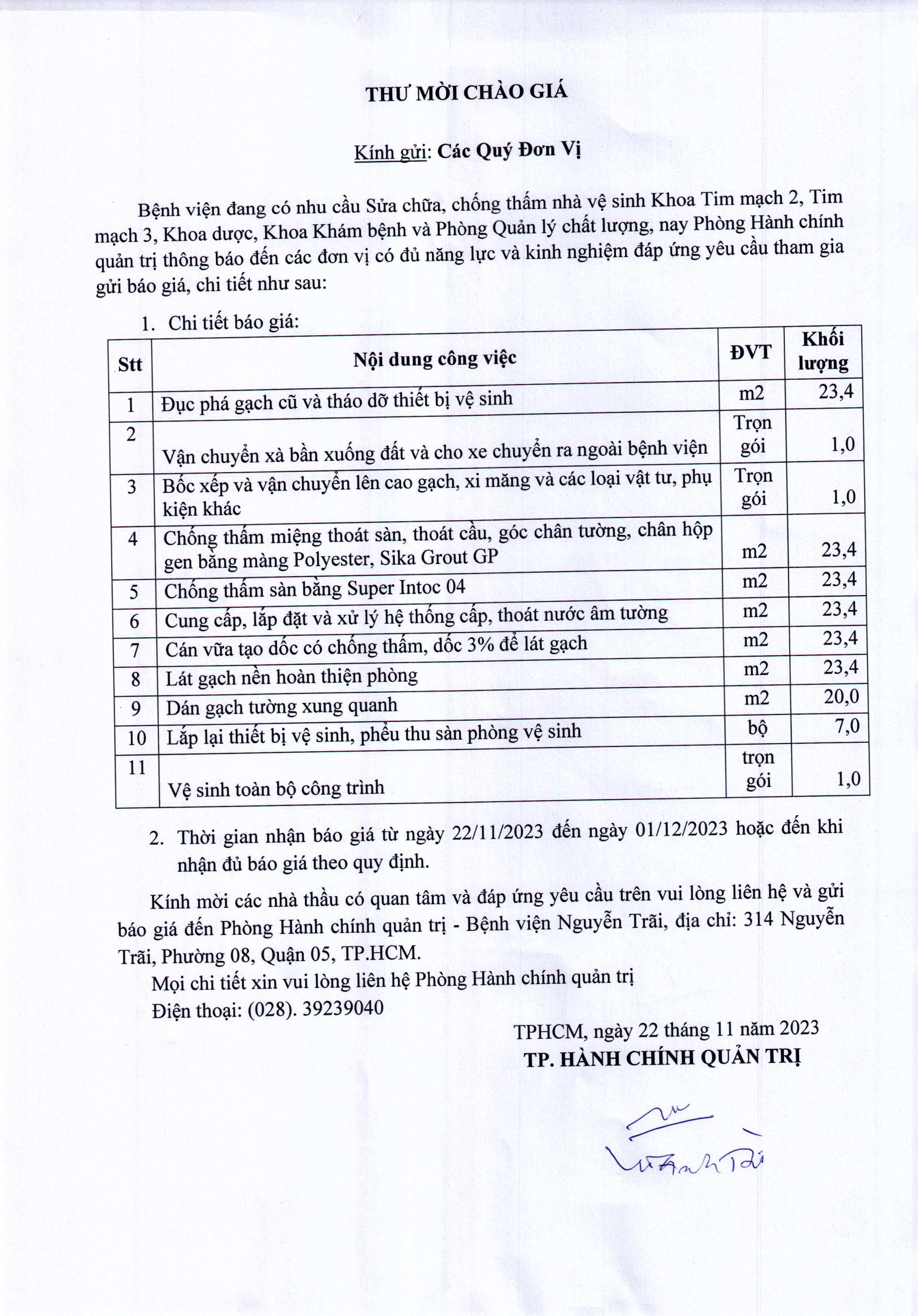 Thư mời chào giá Bệnh viện đang có nhu cầu Sửa chữa, chống thấm nhà vệ sinh khoa Tim mạch 2, Tim mạch 3, khoa dược, khoa Khám bệnh và phòng Quản lý chất lượng