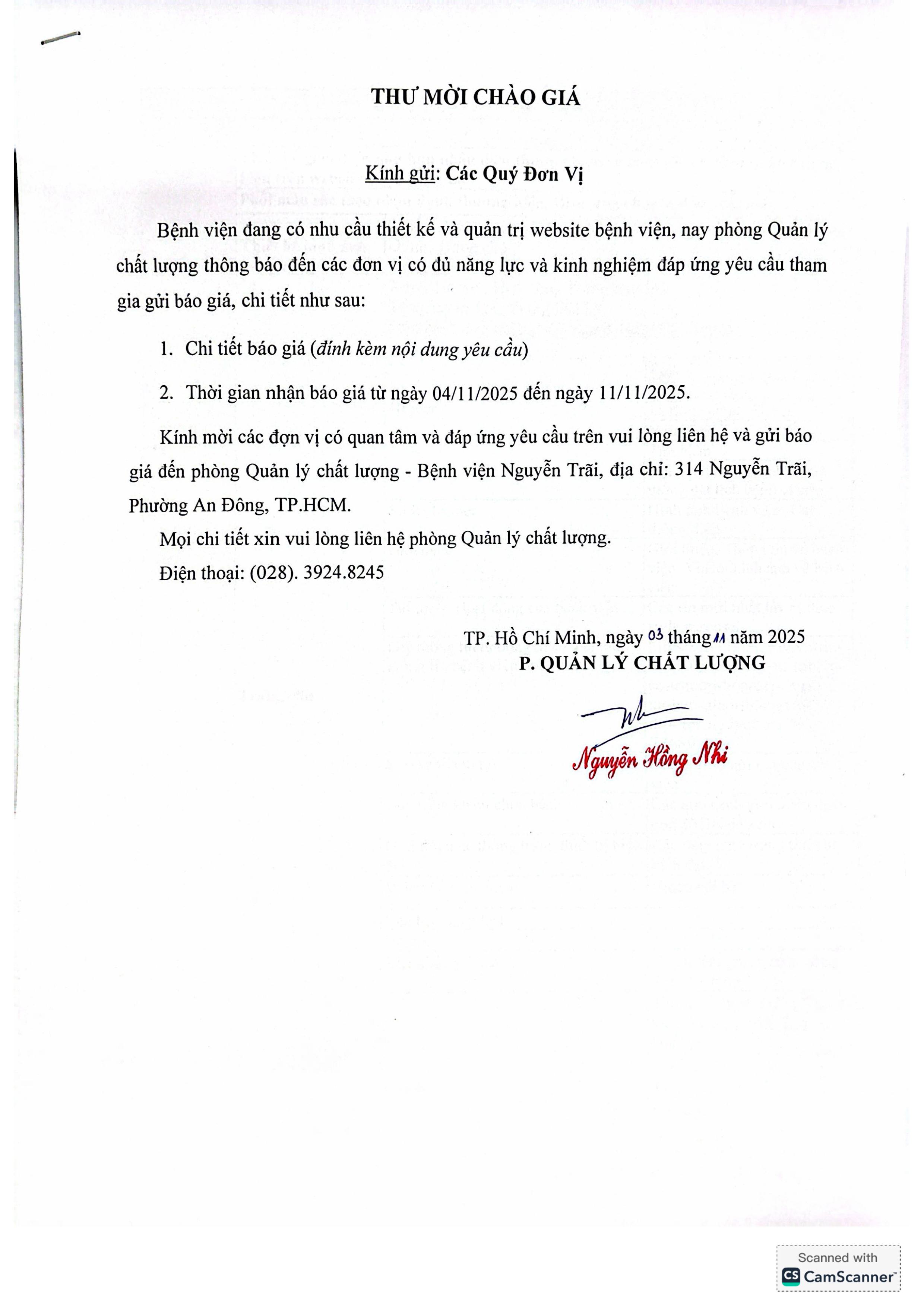 Thư mời chào giá Bệnh viện đang có nhu cầu thiết kế và quản trị website bệnh viện