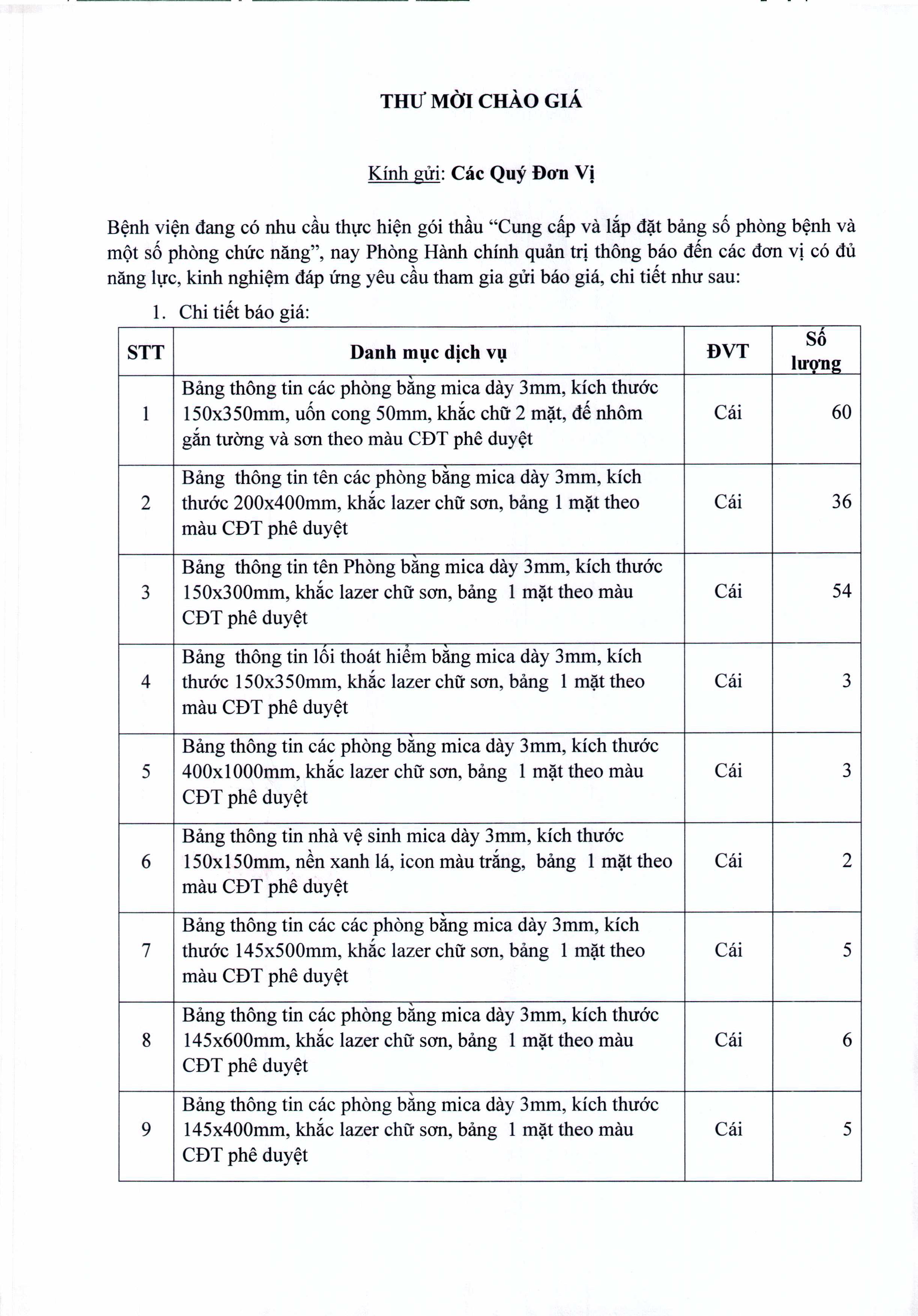 Thư mời chào giá Bệnh viện đang có nhu cầu thực hiện gói thầu “Cung cấp và lắp đặt bảng số phòng bệnh và một số phòng chức năng”