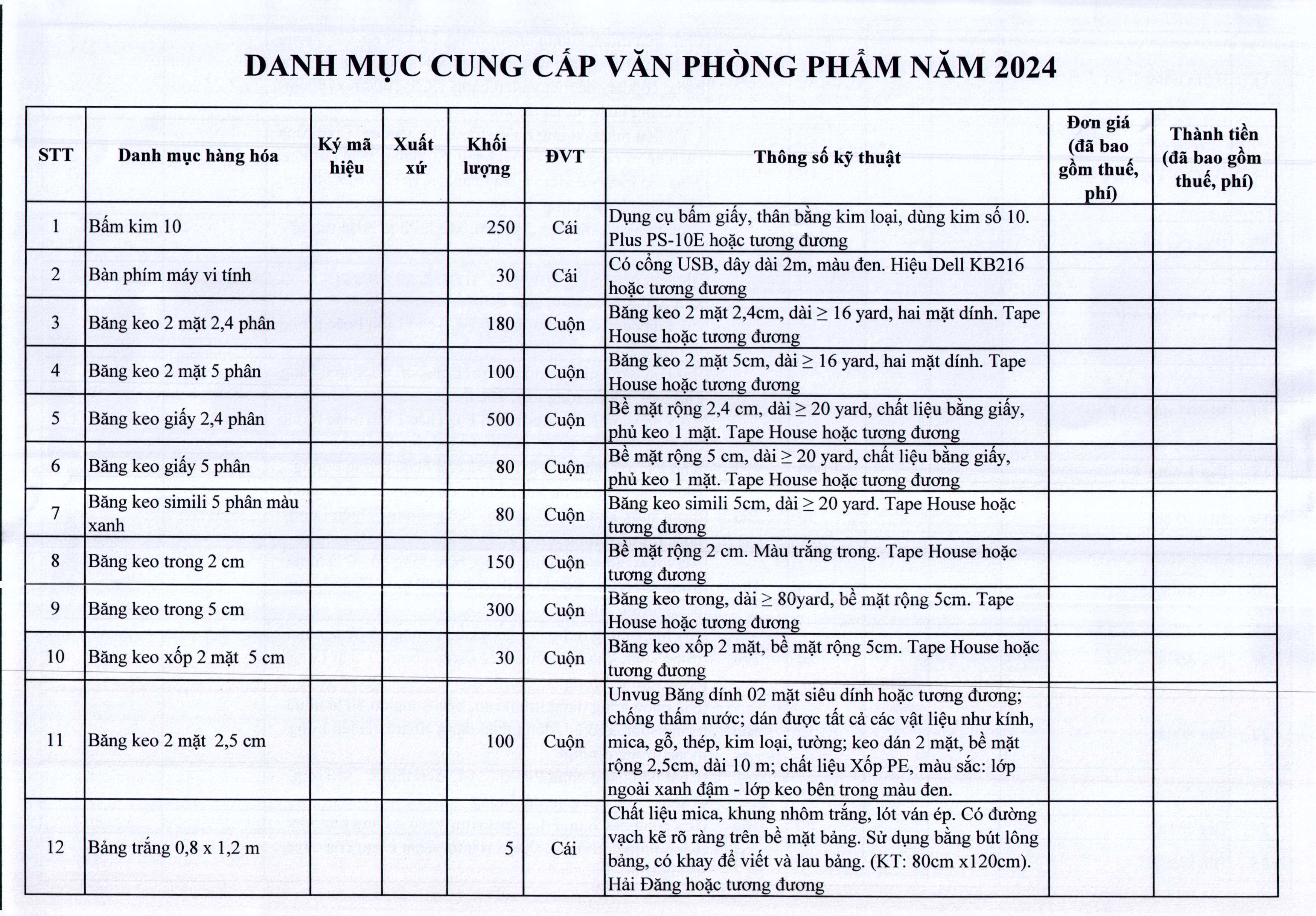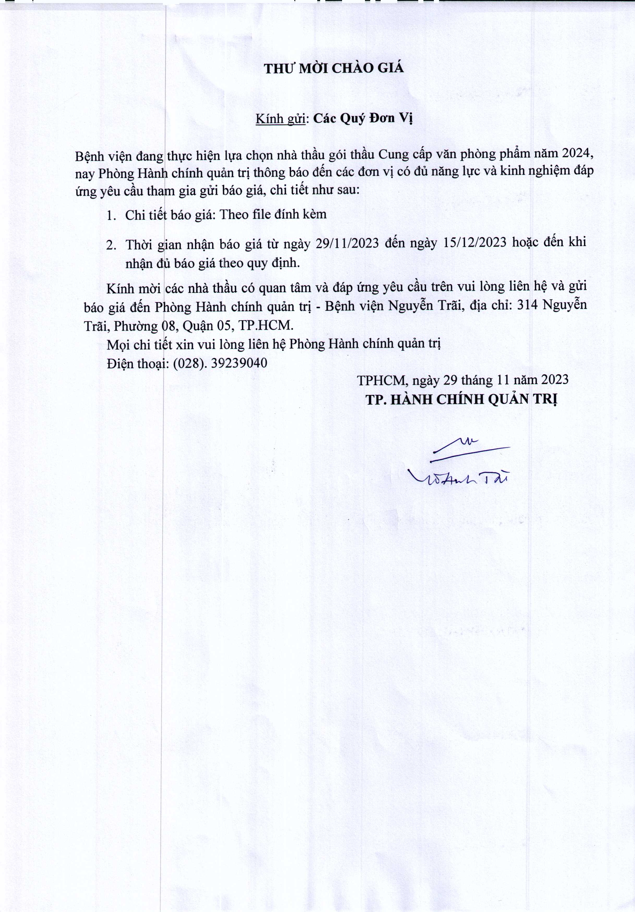 Thư mời chào giá Bệnh viện đang thực hiện lựa chọn nhà thầu gói thầu Cung cấp văn phòng phẩm năm 2024