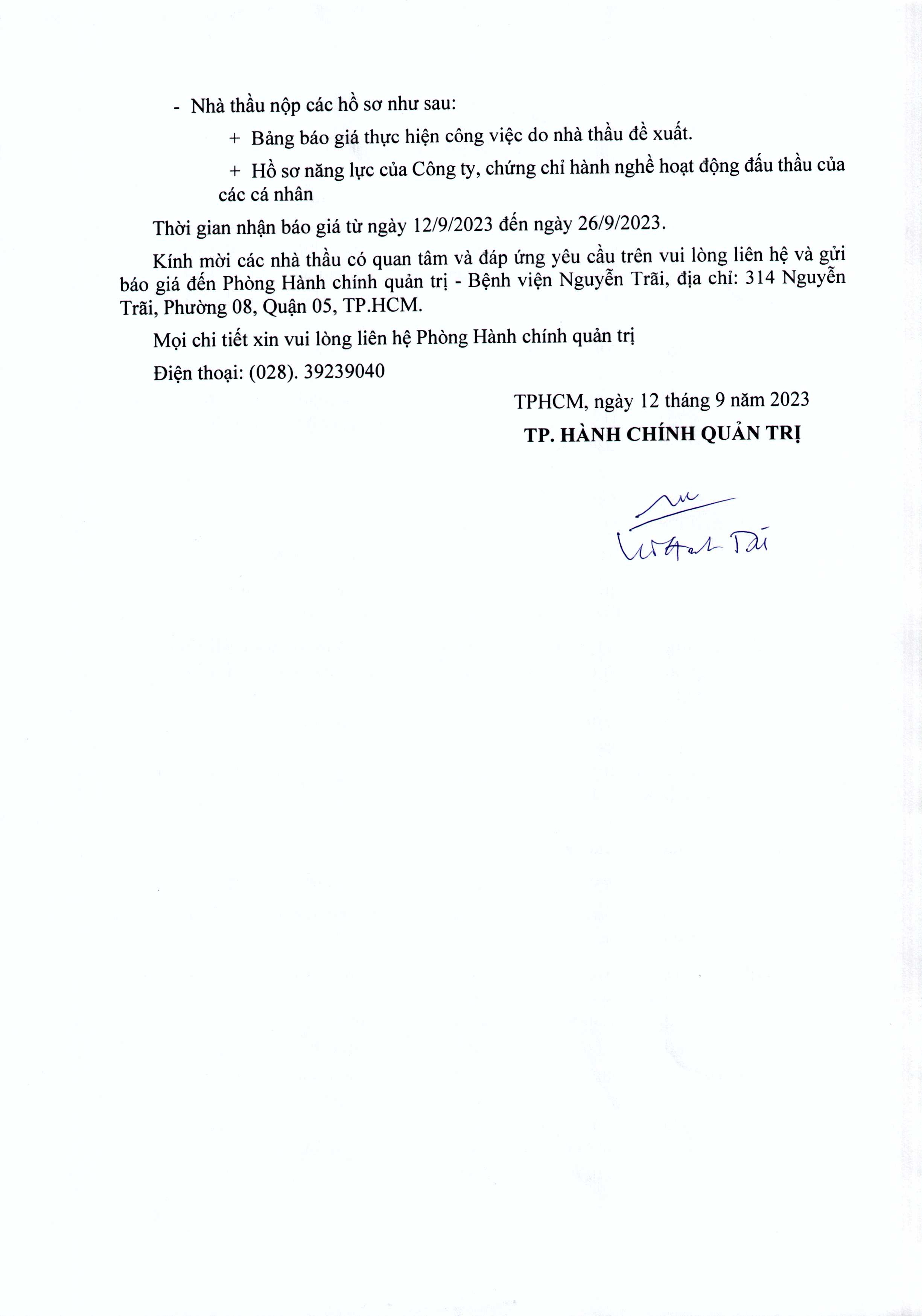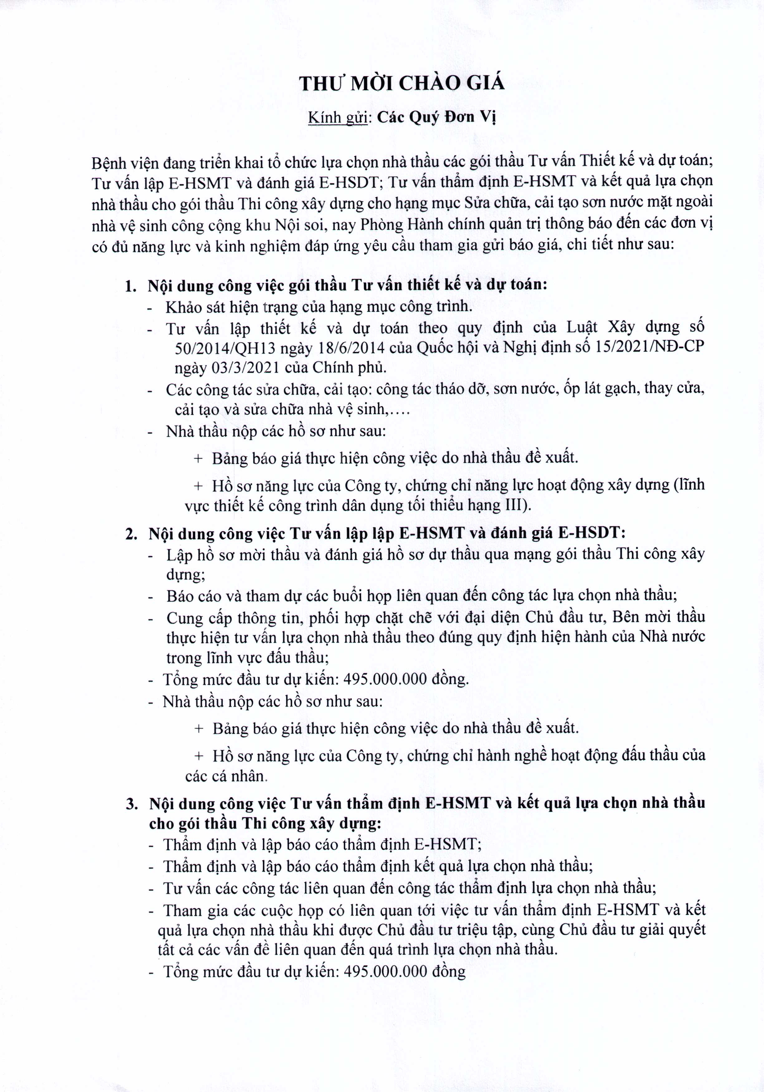Thư mời chào giá Bệnh viện đang triển khai tổ chức lựa chọn nhà thầu các gói thầu tư vấn thiết kế và dự toán, tư vấn lập E-HSMT và đánh giá E-HSDT, tư vấn thẩm định E-HSMT và kết quả lựa chọn nhà thầu cho gói thầu thi công xây dựng cho hạng mục sửa chữa,