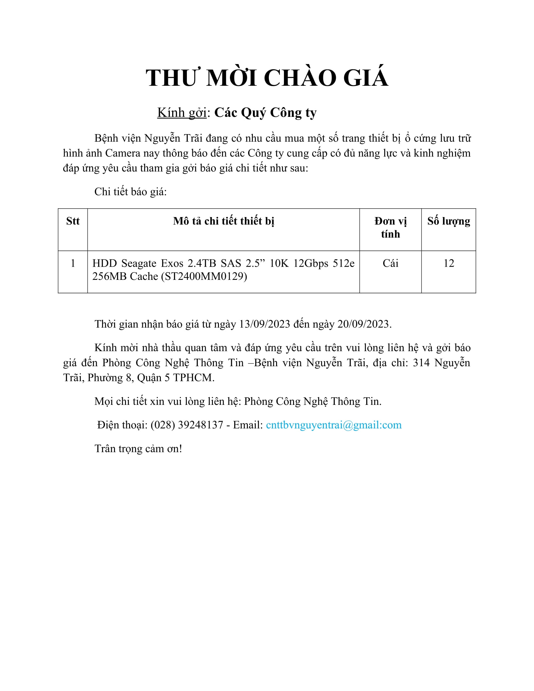 Thư mời chào giá bệnh viện Nguyễn Trãi có nhu cầu mua một số trang thiết bị ổ cứng lưu trữ hình ảnh Camera