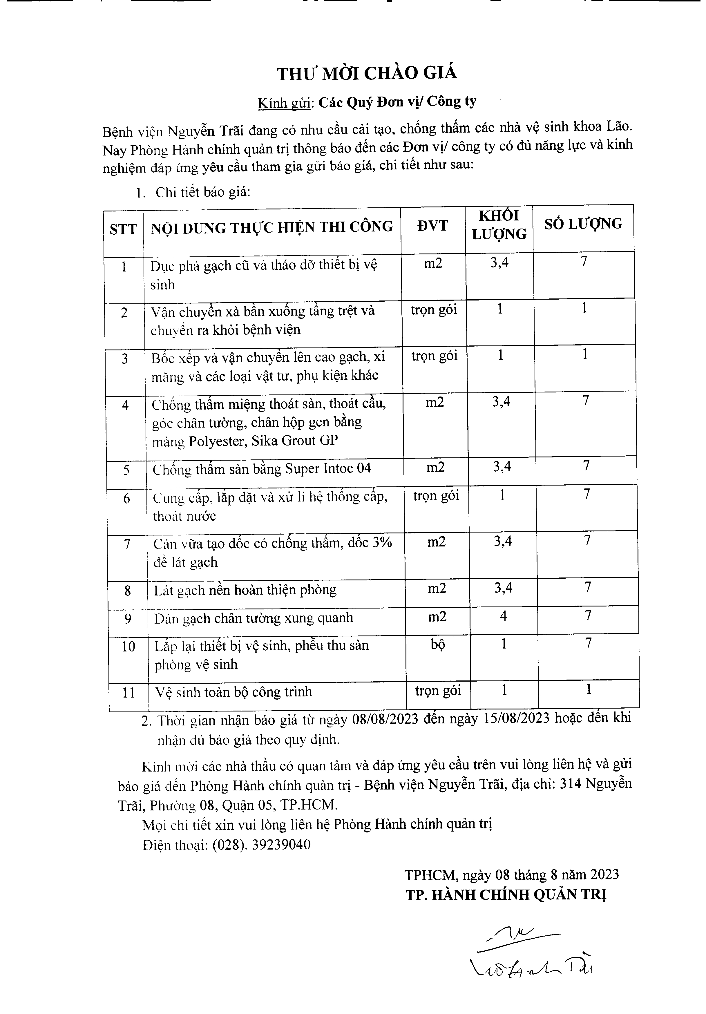 Thư mời chào giá bệnh viện Nguyễn Trãi đang có nhu cầu cải tạo, chống thấm các nhà vệ sinh khoa Lão