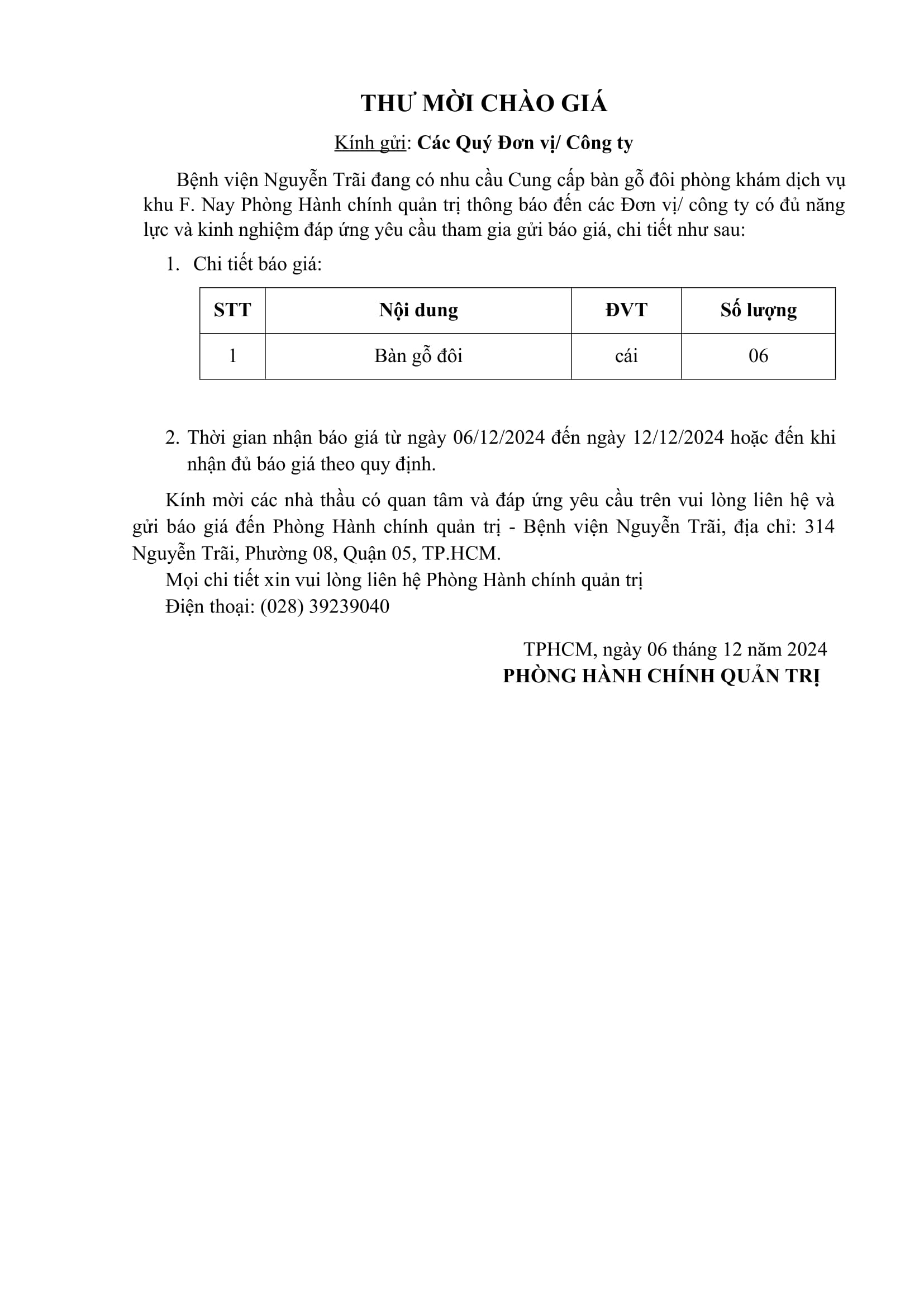 Thư mời chào giá Bệnh viện Nguyễn Trãi đang có nhu cầu Cung cấp bàn gỗ đôi phòng khám dịch vụ khu F